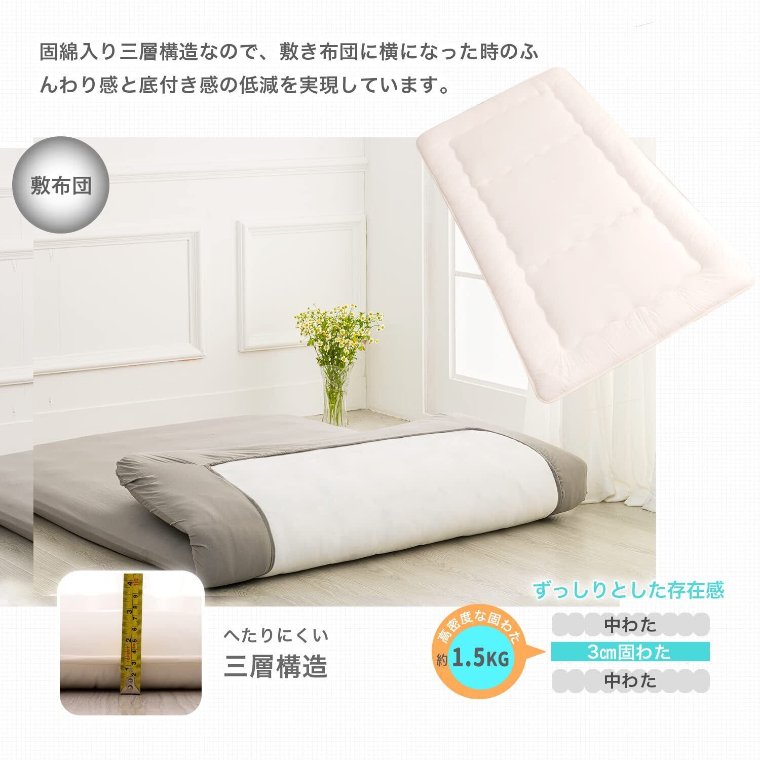 【敷き布団】サイズ:幅100×長さ210cm 側生地:ポリエステル100%(ピーチスキン加工) 詰め物:バージン綿100% 約1.1kg+固綿ポリエステル100% 約1.5kg 三層構造のディザイン、コシがあり、優れたクッション性能。固綿入り三層構造なので、フローリングに直ちに敷いても底付き感を減軽、寝返りをうっても快適です。