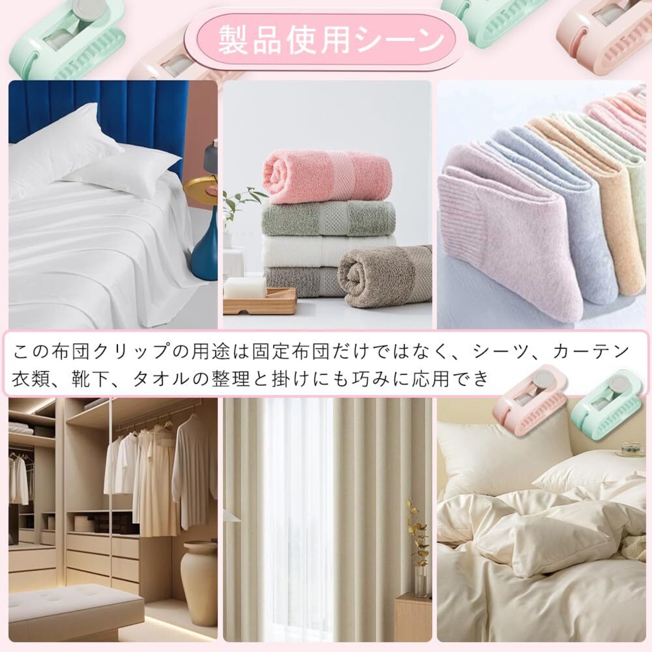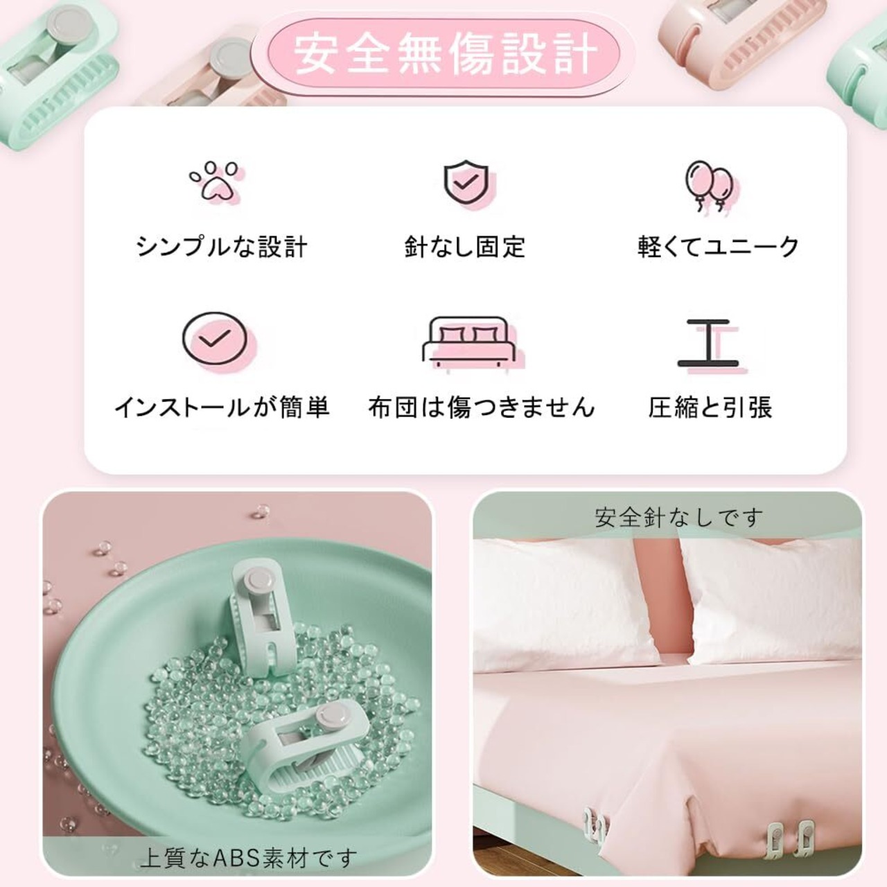 4.便利で効率的な使用体験:セットには6つの布団固定クリップ(ピンク+グリーン)が含まれ、1-2セットの寝具の固定需要に対応でき、紛失したクリップを頻繁に探す必要がない。インストールプロセスは迅速で簡単で、数秒で完了でき、より多くの貴重な時間を解放できます。