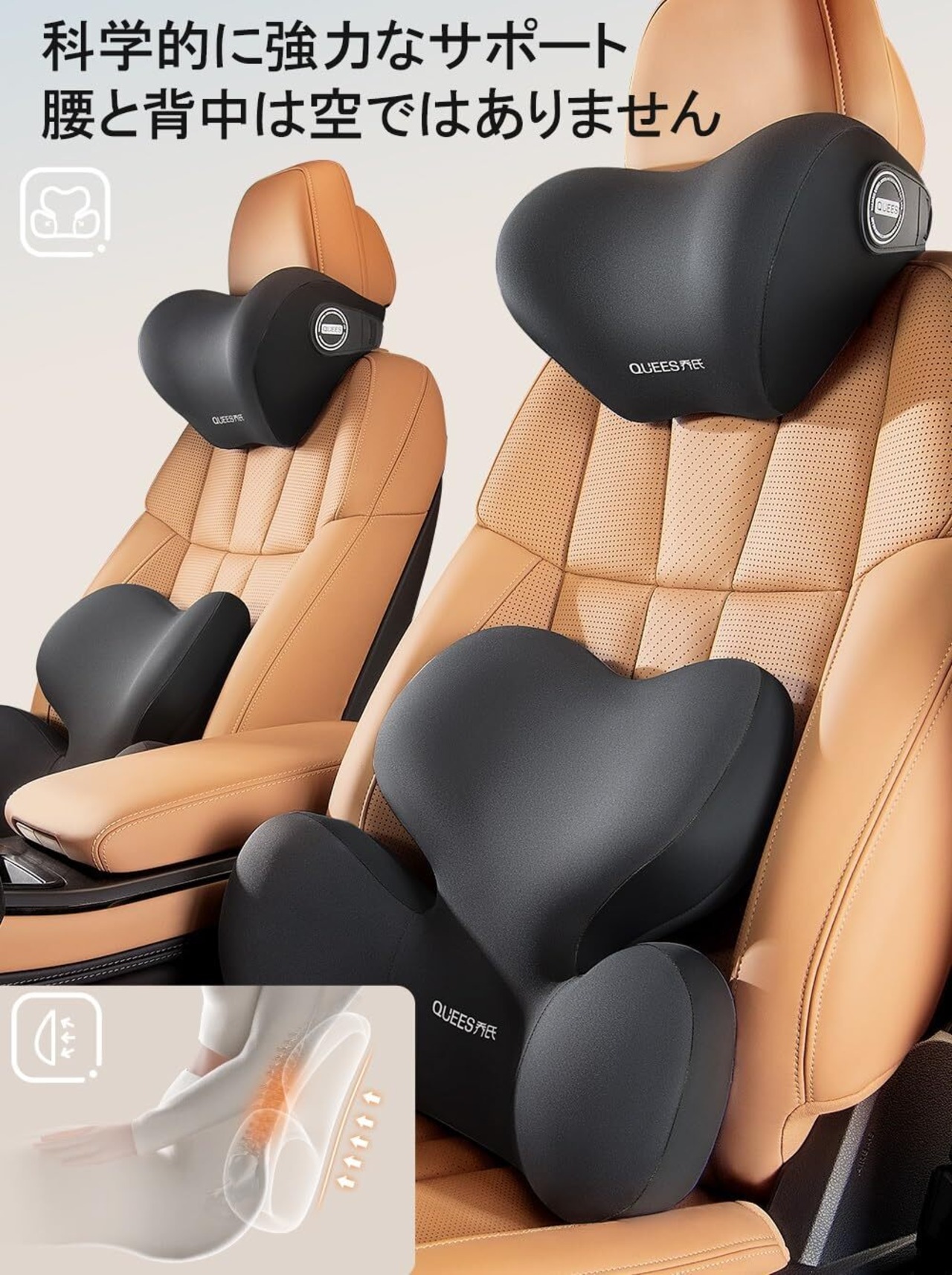 【独占デザイン】腰部クッションは人間工学に基づいたU字型カーブデザインを採用しています。採用したドイツ輸入のメモリーコットンは体のカーブとぴったりフィットできて、座面と背もたれの隙間を埋め、両側から腰を包み込んで支え、正しい座り姿勢を実現します。このランバーサポートにより、痛みに悩むドライバーも快適に運転できます。