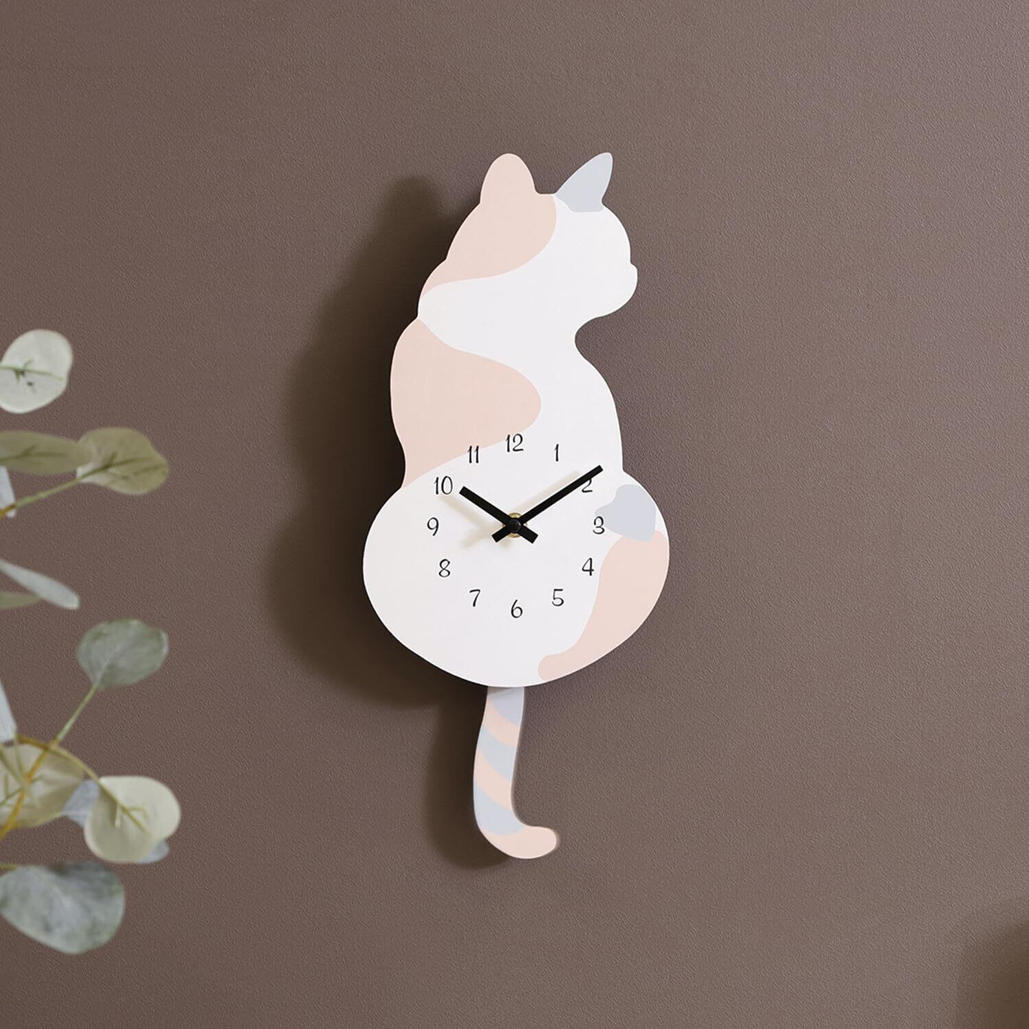 揺れるしっぽがかわいいネコの振り子時計。静音のスイープムーブメントで文字盤を滑るように連続的に針が動きます。