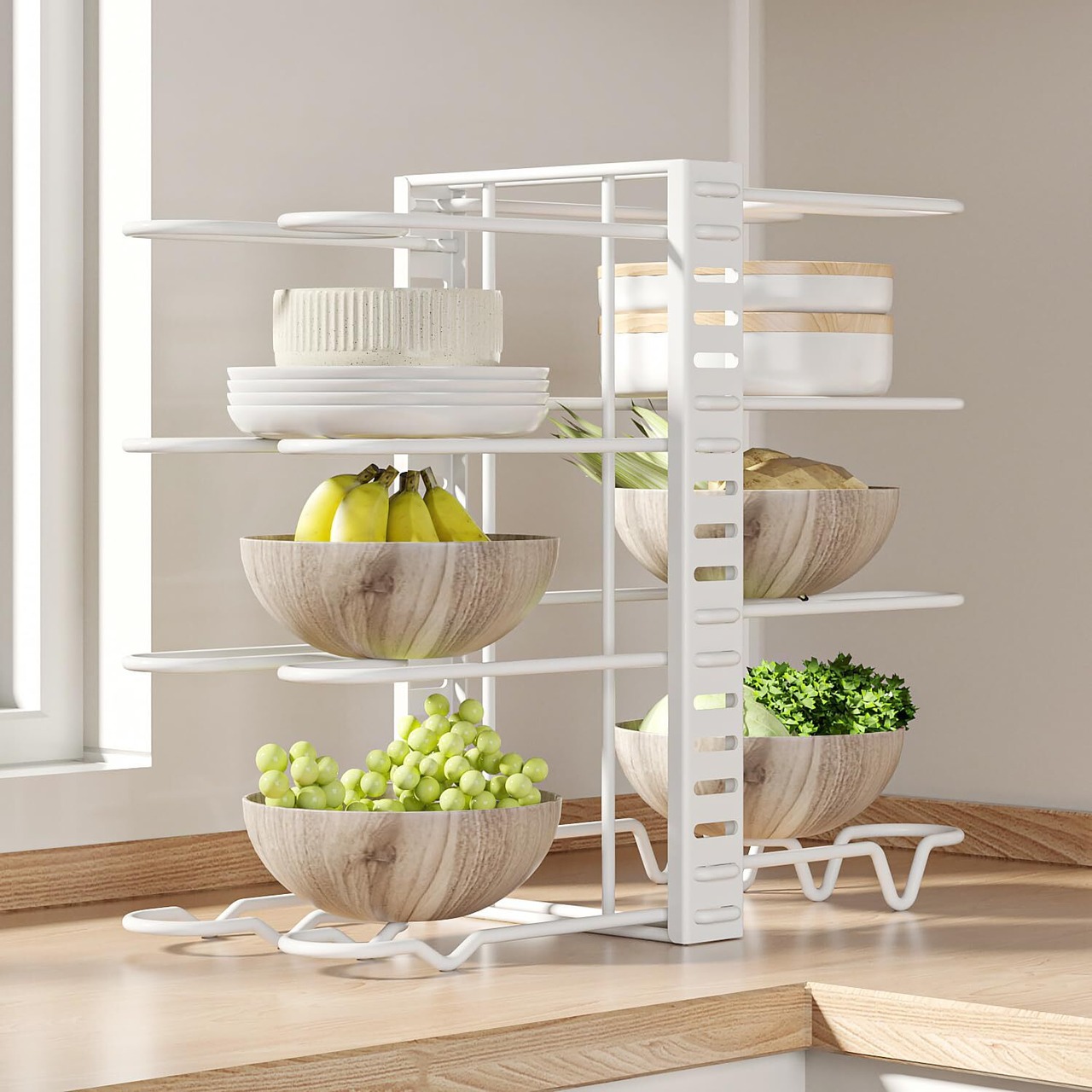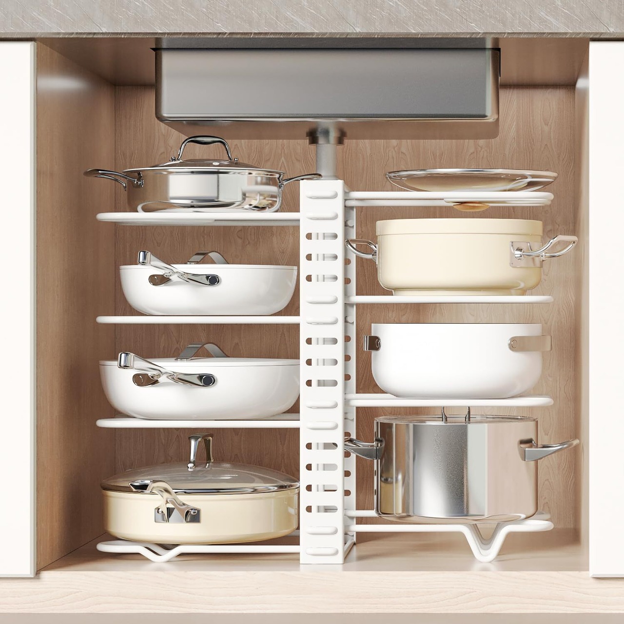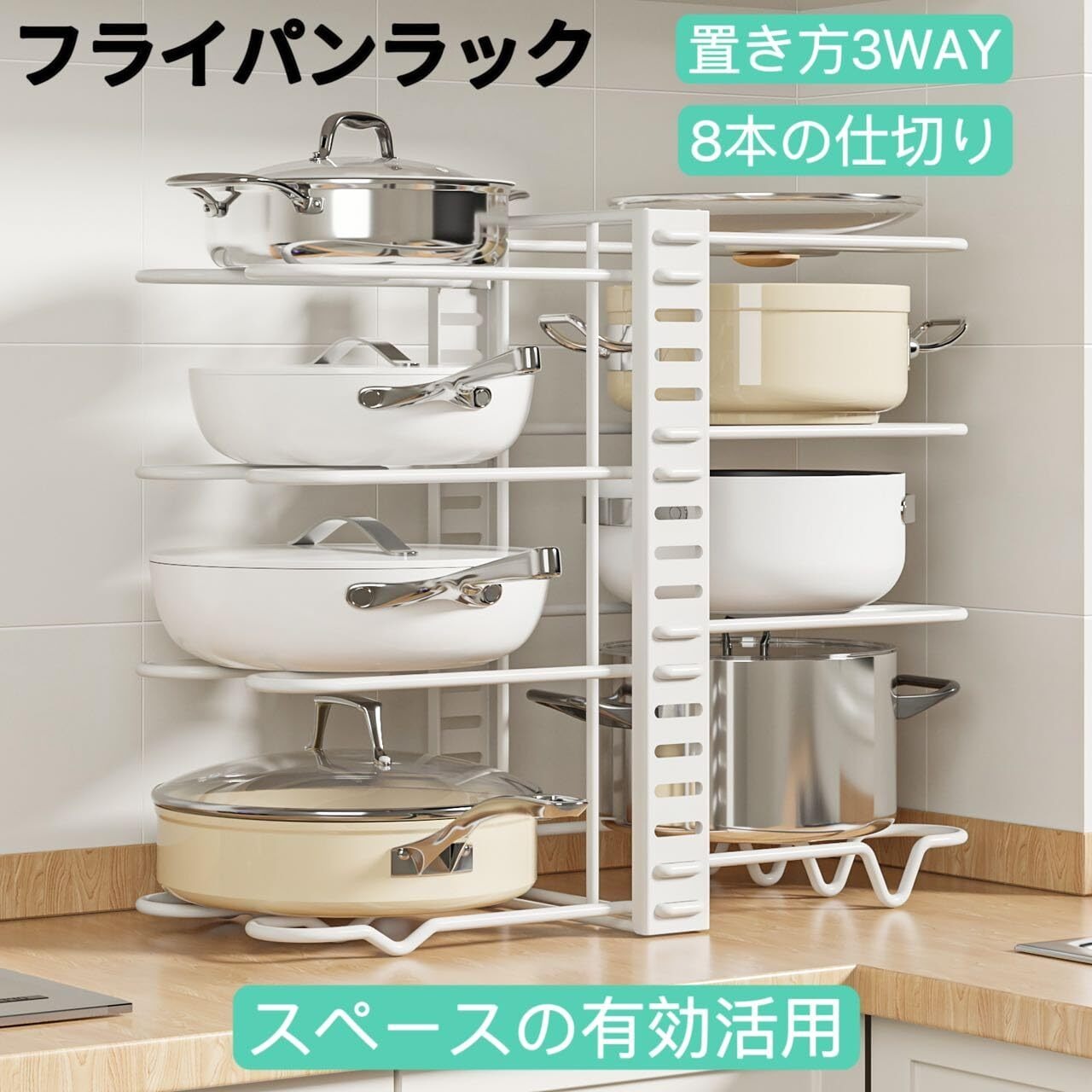 LUCKYSHIN 鍋収納ラック フライパン収納 8段 フライパンラック 多機能収納 シンク下 縦置き 横置き キッチン収納 ラック 鍋蓋スタンド 高さ調整可能 (縦置き8段, ホワイト)