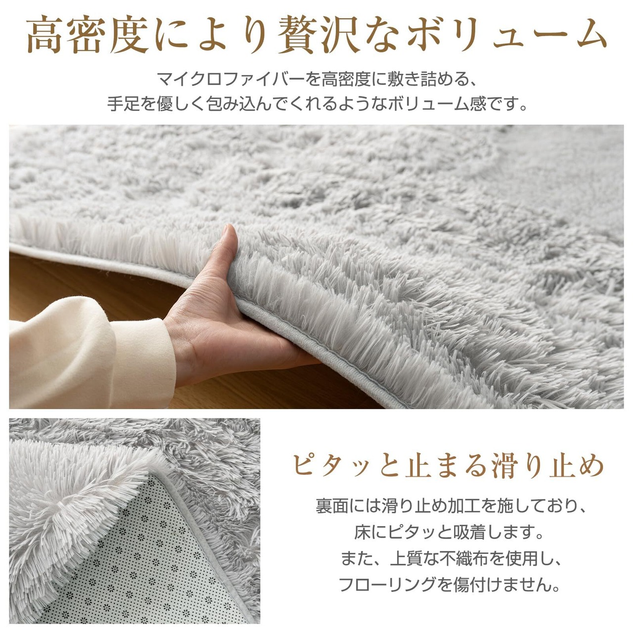 【オールシーズン使えるラグ】ラグの毛足の素材には、通気性が良く速乾性に優れたマイクロファイバーを使用しています。柔らかな踏み心地で、夏場はサラッと快適に過ごせます。冷房機器と併用することで、さらに快適な空間を実現します。耐熱加工が施されているため、冬場はホットカーペットや床暖房の上でも使用可能。フワフワと暖かく、居心地の良さを提供します。