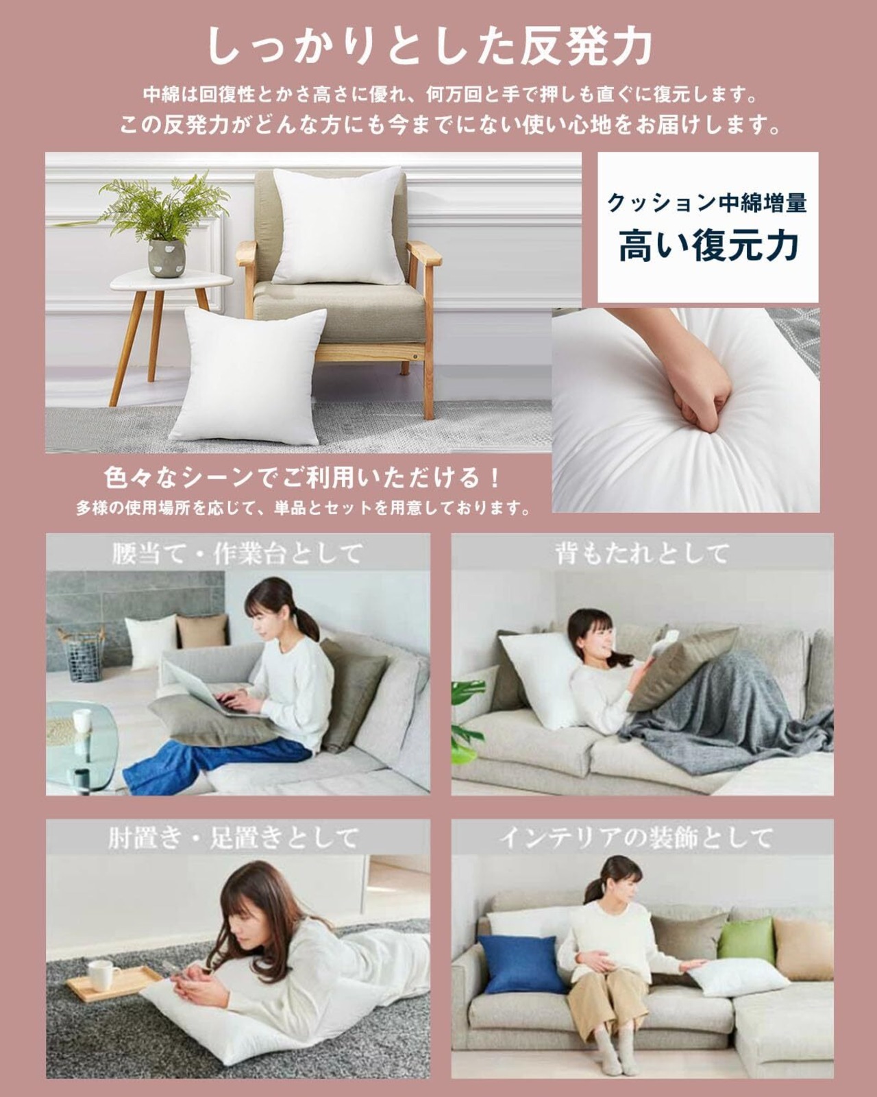 「ホテル級!ふんわり気持ちいい」 素材がポリエステル100%で、通気性と吸湿性が優れて、肌に優しい敏感肌にも大丈夫です。グーッと沈みこむようなしっかりとした弾力があり、寄りかかった時に安定感があります。座布団として使っても、従来のクッションより底付き感がないので、お尻が痛くならないと感じる方も多くいます。長期間使用しても型崩れが起きにくいです。*商品には個体差があります。複数個ご注文いただく場合は、ボリューム感やにおいなどにそれぞれ違いがある可能性がございますことを、あらかじめご了承くださいませ。
