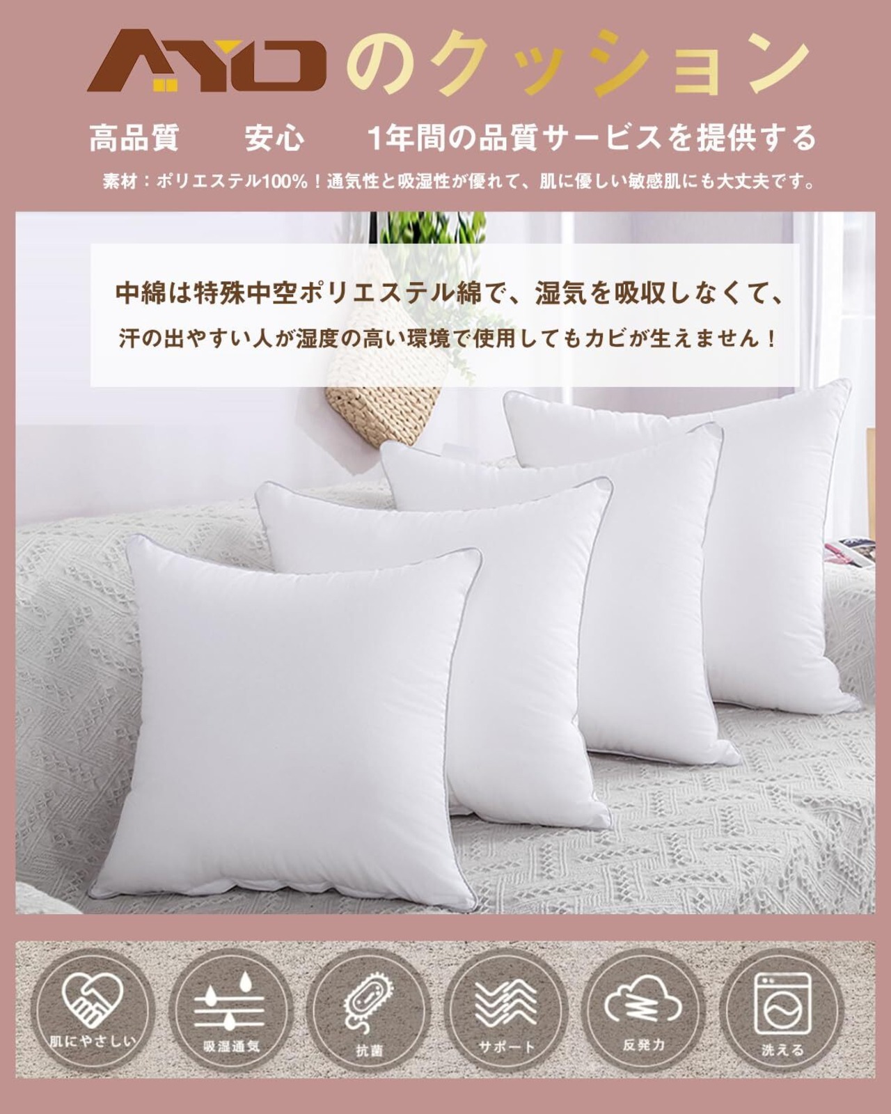 「仕様」 クッション中身:45x45cm 2個セット;カラー:ホワイト;対応カバーサイズ:40~45cmです。AYO ショップは1年間返品保証を用意いたしました。ご購入日から1年間以内に商品保証期間となり、万が一商品不良の場合、開封後の商品や、ご洗濯後の商品など構いません。ご連絡いただき次第、迅速に交換、返品及び返金を対応させていただきます。お客様のニーズより満足できるよういいサービスを提供させていただきます。
