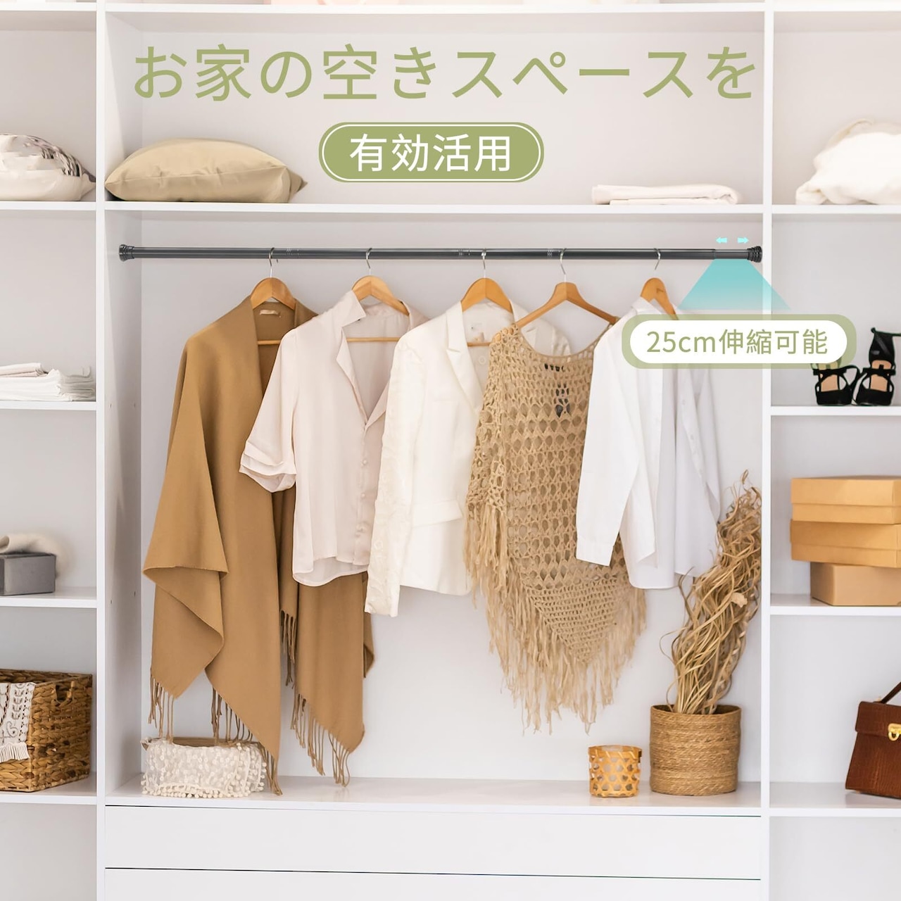 使用範囲が広く、クローゼット、洗面台、ドアと窓の壁面に突っ張り棒を支えて、キッチン用品収納、タオル、洋服、カーテン用などです。