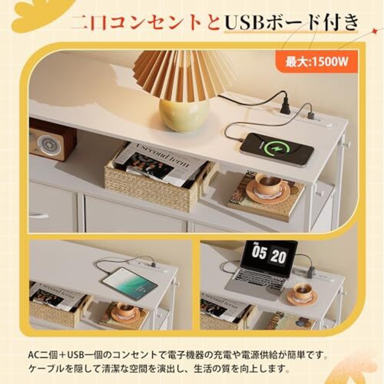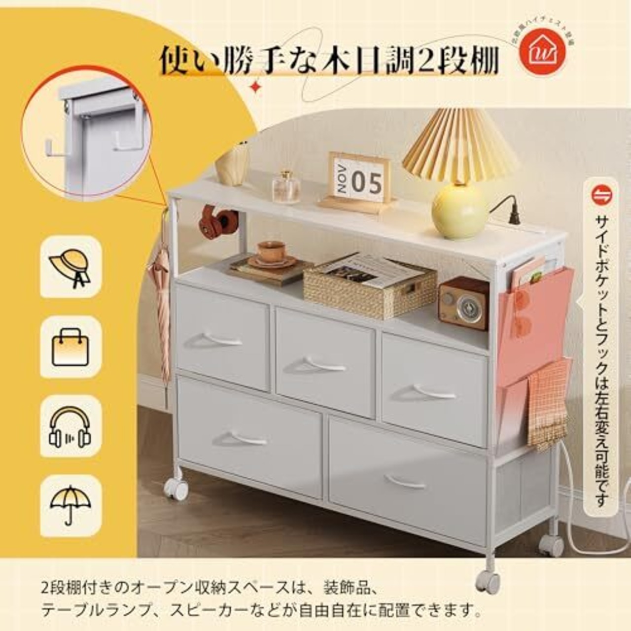 チェスト タンス 2段棚付き収納 コンセント付き USBボード キャスター付き サイドポケット付き 2段5杯 箪笥 ローチェスト リビング収納 おしゃれ 収納チェスト 布製 引き出し 大容量 洋服タンス 衣類収納 北欧 シンプル ホワイト ASNG608