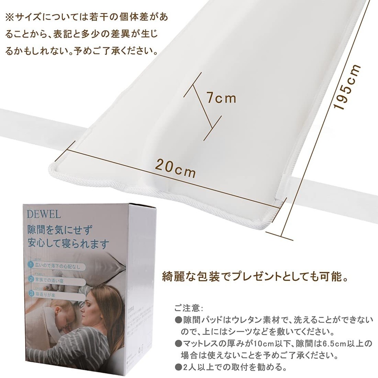 【包装内容】:すきまパッド、固定ベルト、取扱説明書 【ご注意】:隙間パッドは水洗い不可で、上にはシーツなどを敷いてください。隙間は6.5cm以上の場合は隙間パッドは使えません。