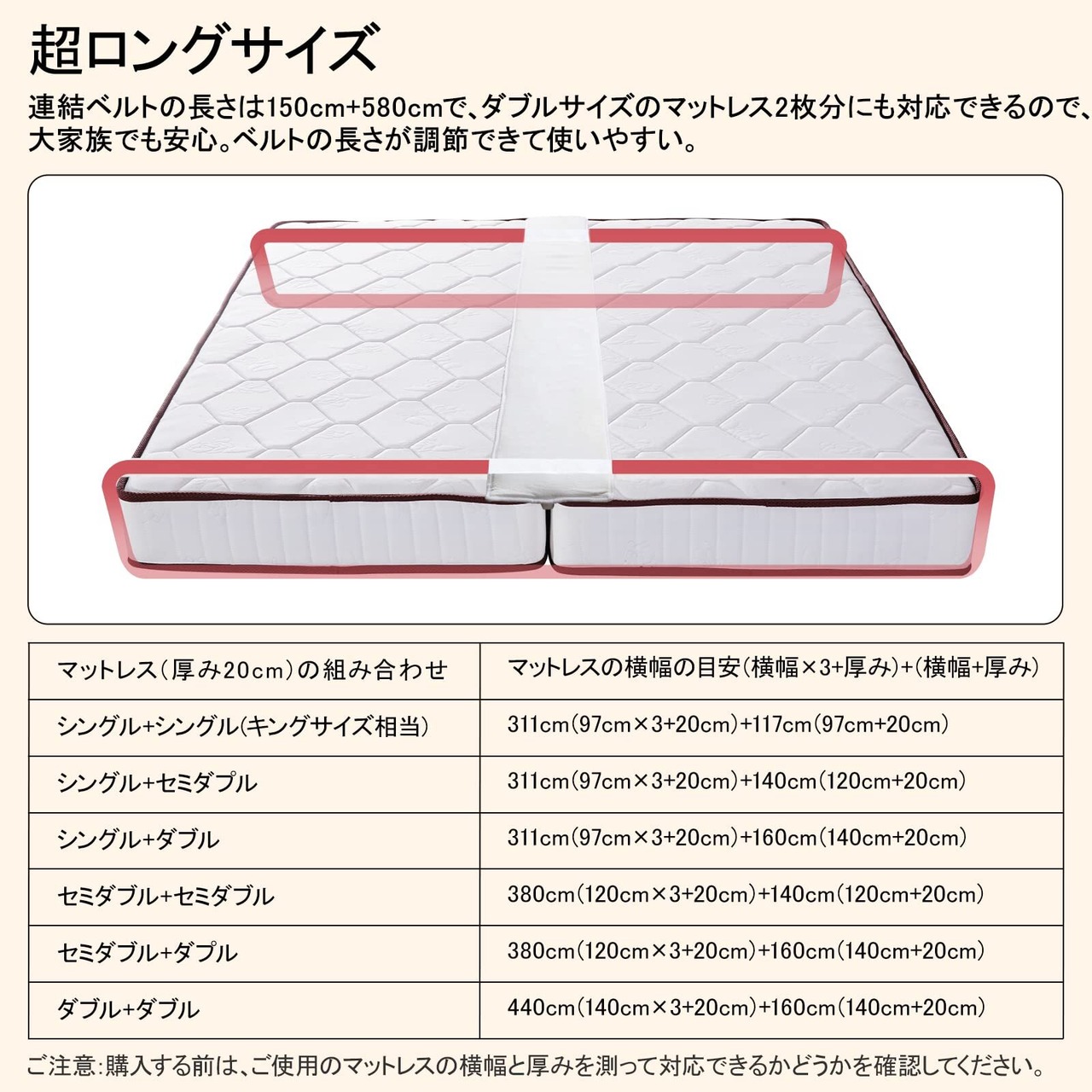 【大家族でも安心】連結ベルトの長さは1.5m+5.8mで、ダブルサイズのマットレス2枚分にも対応できるので、大家族でも安心です。ベルトの長さが調節できて殆どのマットレスに適用できます。