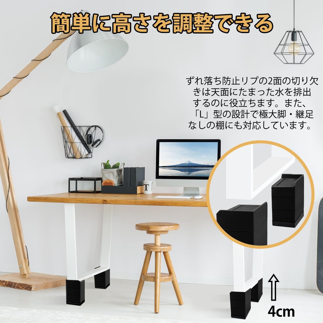 【必要に応じて高さを調節する】脚を置く天面のサイズ(11.6×6.1cm)がほとんどの家電製品と家具の脚に合っています。また、2個または4個を併用したら、大きめサイズの足にも対応しています。例えば、お子様の成長に合せて机の高さを調整できます。コタツ足の継ぎ脚として、寝転がっても腰が当たらず楽々です。仕事中、正しい座る姿勢を維持するために、オフィスデスク・椅子の高さを調節したいです。ベッド・ソファーを上げたら収納スペースを拡大することもできます。