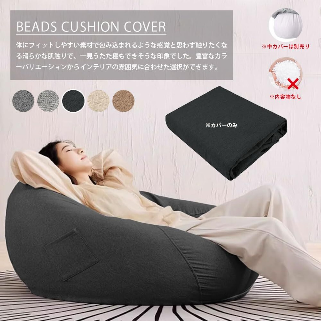 【ポケット付き】:サイドにポケットが付いているので、カードなどの小物は入れることができますが、使いやすいです。気分転換や汚れ交換でお聞かるにカバー交換可能です。ビーズクッションは触れている時間が長いため、皮脂汚れが劣化の原因になりかねません。劣化を防ぐために定期的に手入れをしましょう。