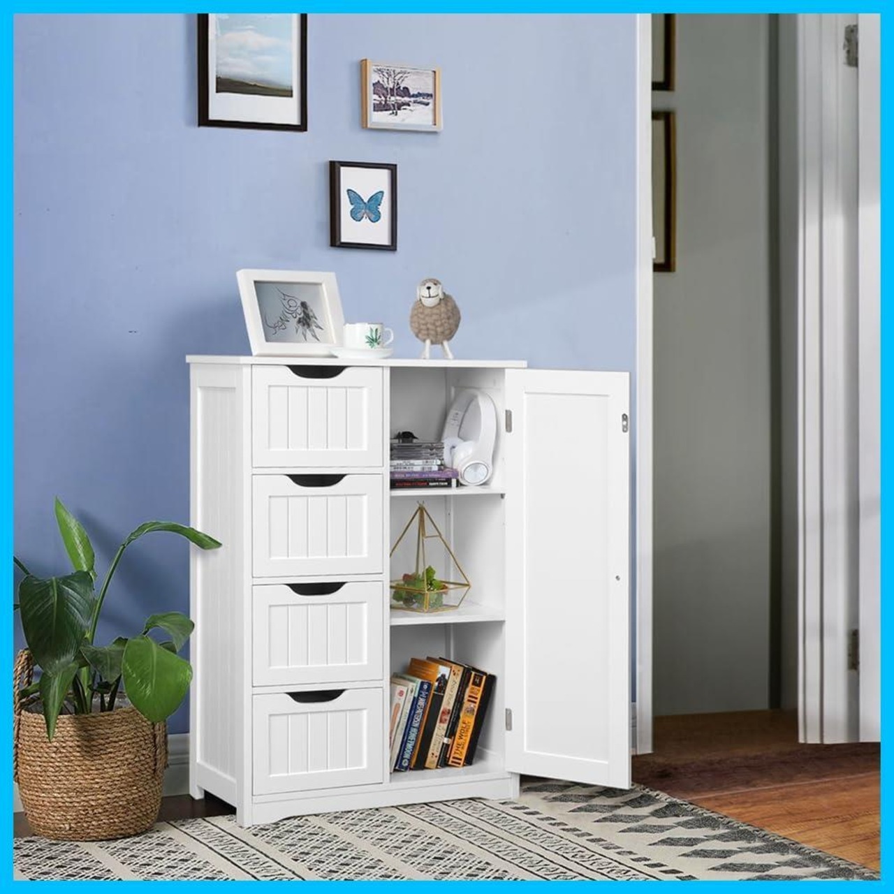 【収納力抜群】:卓上、引き出し4つ、および3段棚板のあるキャビネットは、一般的な家庭用品をうまく収納し、浴室、居間、キッチンなど、収納が必要な場所にぴったりできる実用的な家具です。