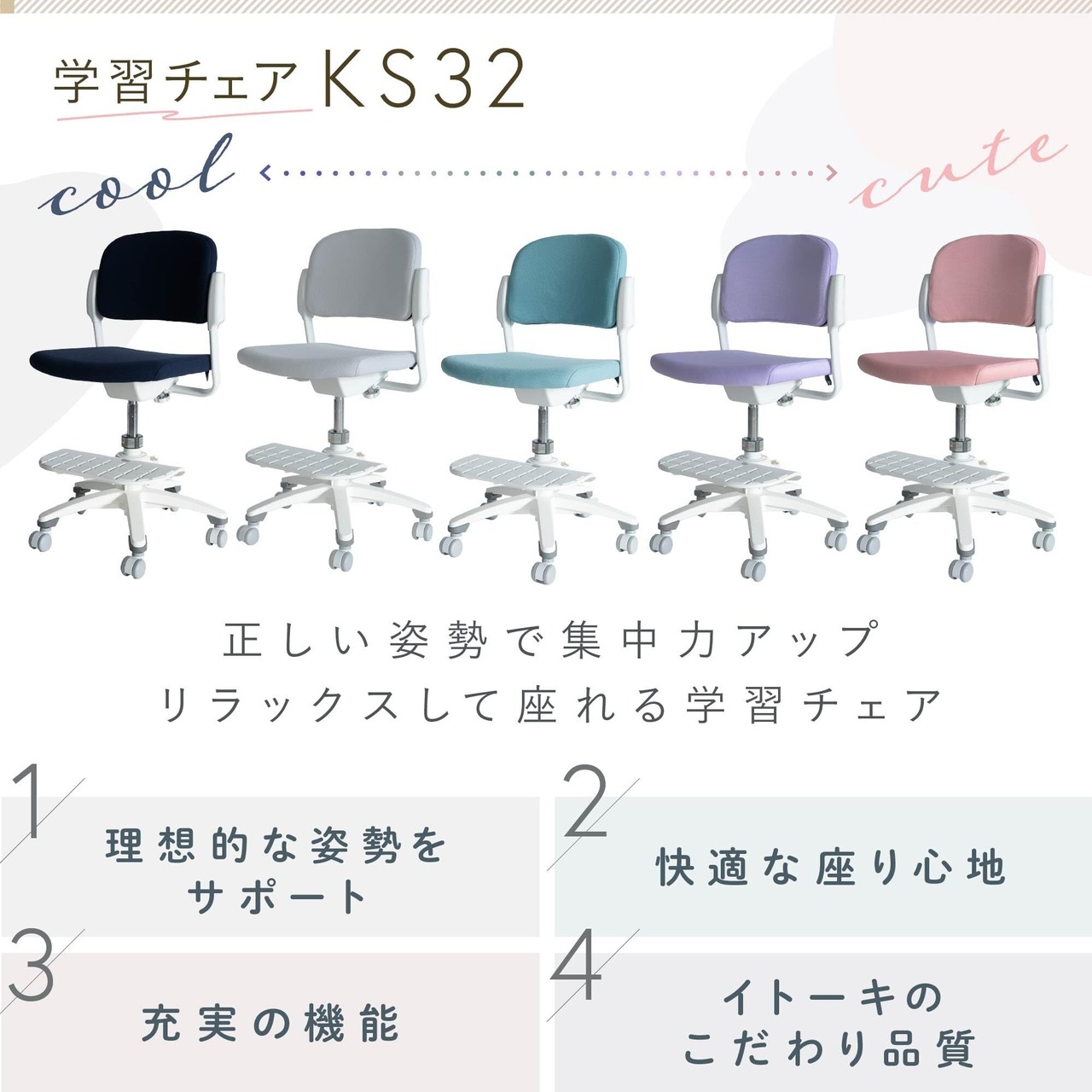 【イトーキ KSチェアハイエンドシリーズ】2010年の発売以来シリーズ(トワイスシリーズ)累計販売台数7万台を突破した大人気シリーズ。KS32のカラーバリエーションは5色展開。お子さまの成長に合わせて細やかに調節できるイトーキ独自の機能を搭載し、正しい姿勢と休息姿勢の両方をしっかりサポートします。