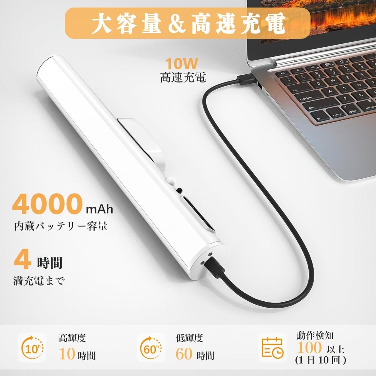 【長時間のバッテリー寿命】この卓上マグネットバーライトは、4000mAhのUSB充電式バッテリーを内蔵しています。常時点灯モードでは10〜60時間の連続使用が可能です。モーションセンサーモードでは、1日10回の使用で100日以上の連続使用が可能です。フル充電にはわずか4時間しかかかりません。