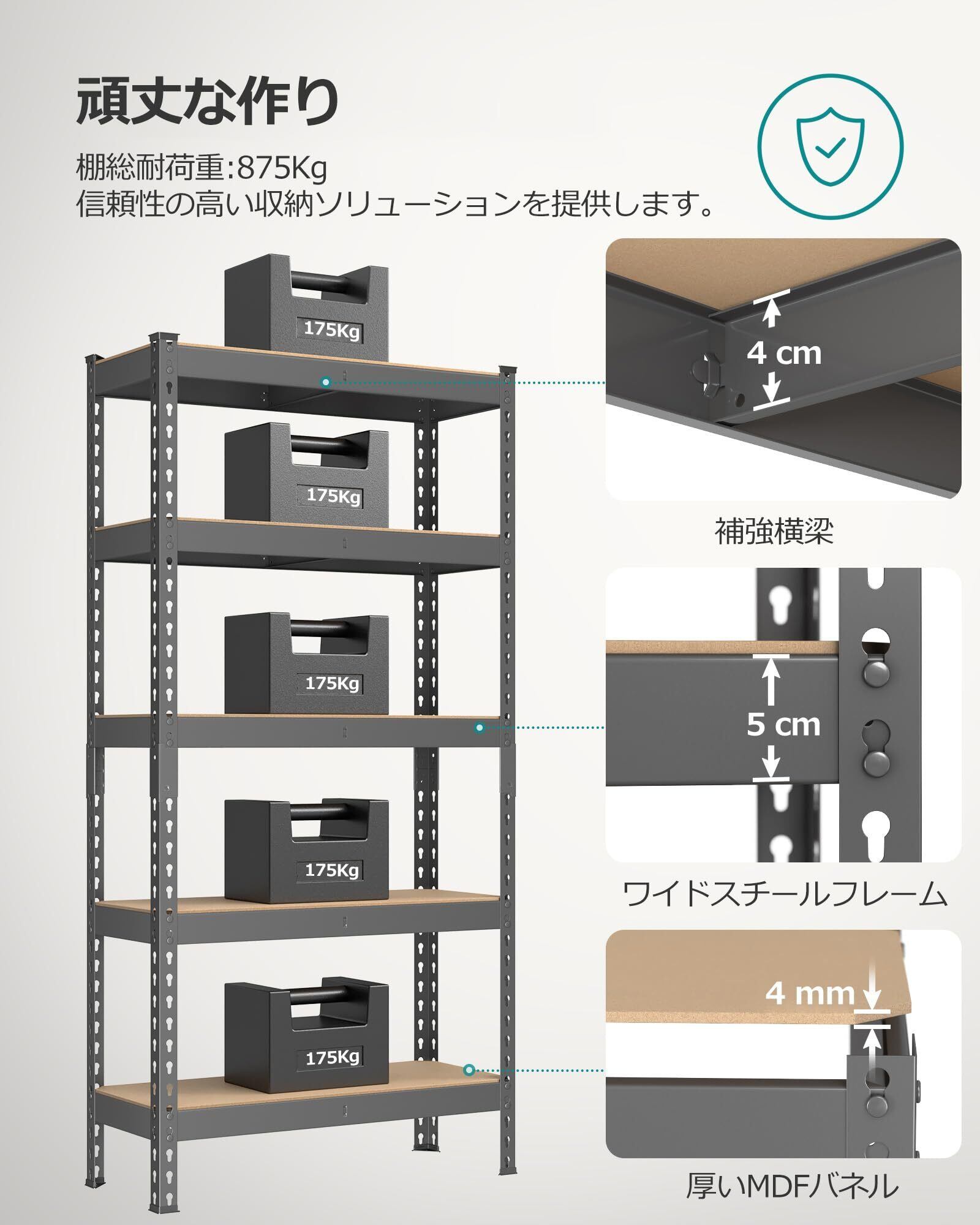 【抜群の耐久性と収納力】棚板1枚当たり約175kgの耐久性があり重い物を乗せても耐えられます。総耐荷重は875KGです。