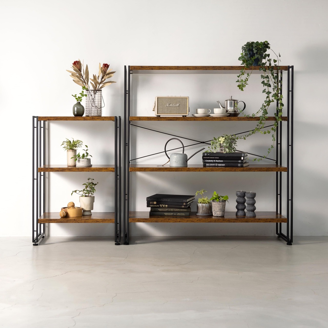【サイズバリエーションの豊富さ】 ●ちょっとした収納として使うコンパクトサイズから大容量の収納ができる大型サイズまで、使用方法に合わせて棚板の数(3段・4段)と幅(5種類)と奥行き(2種)カラー(2種)を選べます。 ●高さが違うアイテムを横に並べても統一感が出るように、棚板の高さを全て統一しています。