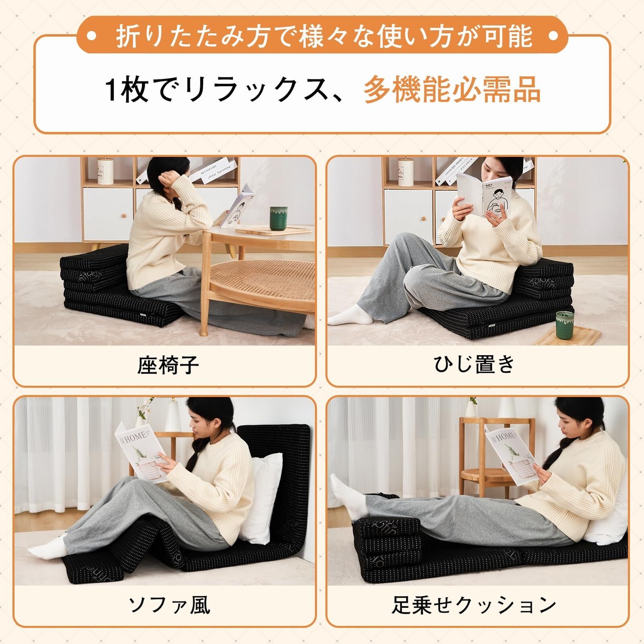 【豊富な使用シーン】特殊形状と折り畳み方により、5つのパーツに分かれた本製品は多様な使い方が可能です。大人用のマットレスとしてはもちろん、枕やクッション、足枕、座椅子、長座布団、ソファとしても利用でき、気分に応じて形を変えることができます。1枚で多機能を果たすリラックスタイムの必需品です。