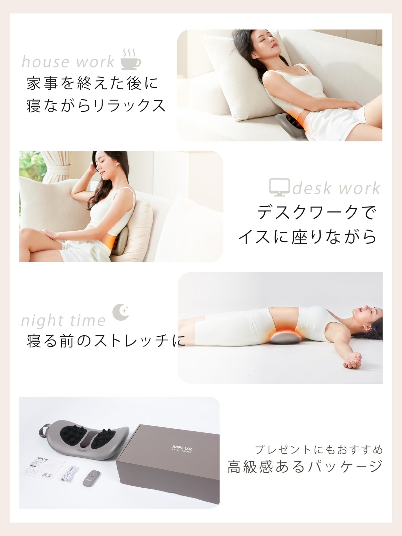 【腰を温めじんわりリラックス】NIPLUX 腰クッションは気分に合わせて使える、2段階の温熱機能を搭載しています。腰回りを温めることで、腰も身体全体もリラックスします。※加熱オフでのご使用も可能です。