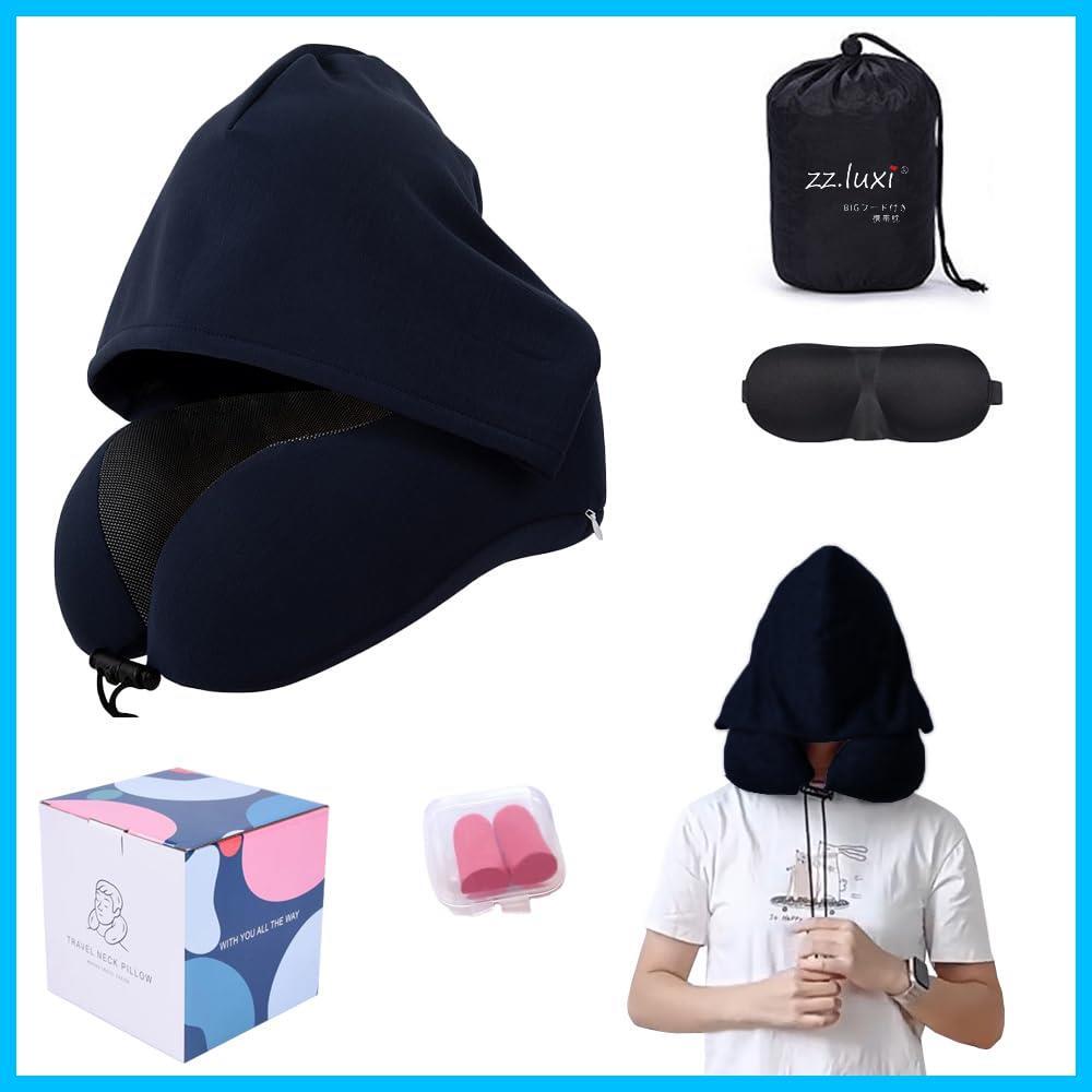 ネックピロー 携帯枕 飛行機 首枕 低反発ネックピロー 大いフード付 最新型顔を隠す 首が痛くならない トラベル枕 U型 首まくら クッションカバー アイマスク 耳栓 収納袋 飛行機 バス 車中泊 夜行バス 新幹線 自宅 旅行 プレゼント 軽量 快眠(ネービー)