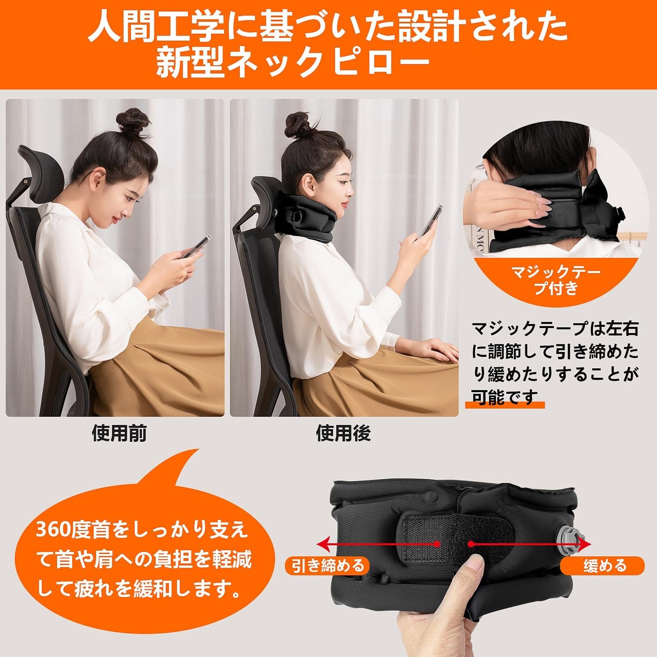 【エアー首枕&ネックサポート】長さ60cm幅15cmのサイズで人体工学デザインを利用して、エアー首枕を使って頭の揺れを抑え、首の痛みを緩和して支持性が良いです。個人の首まわりに合わせてエアー首枕のマジックテープの長さを自由に調節して360度全方位でネックサポートできて心地よい眠りを実現できるネックピローです。