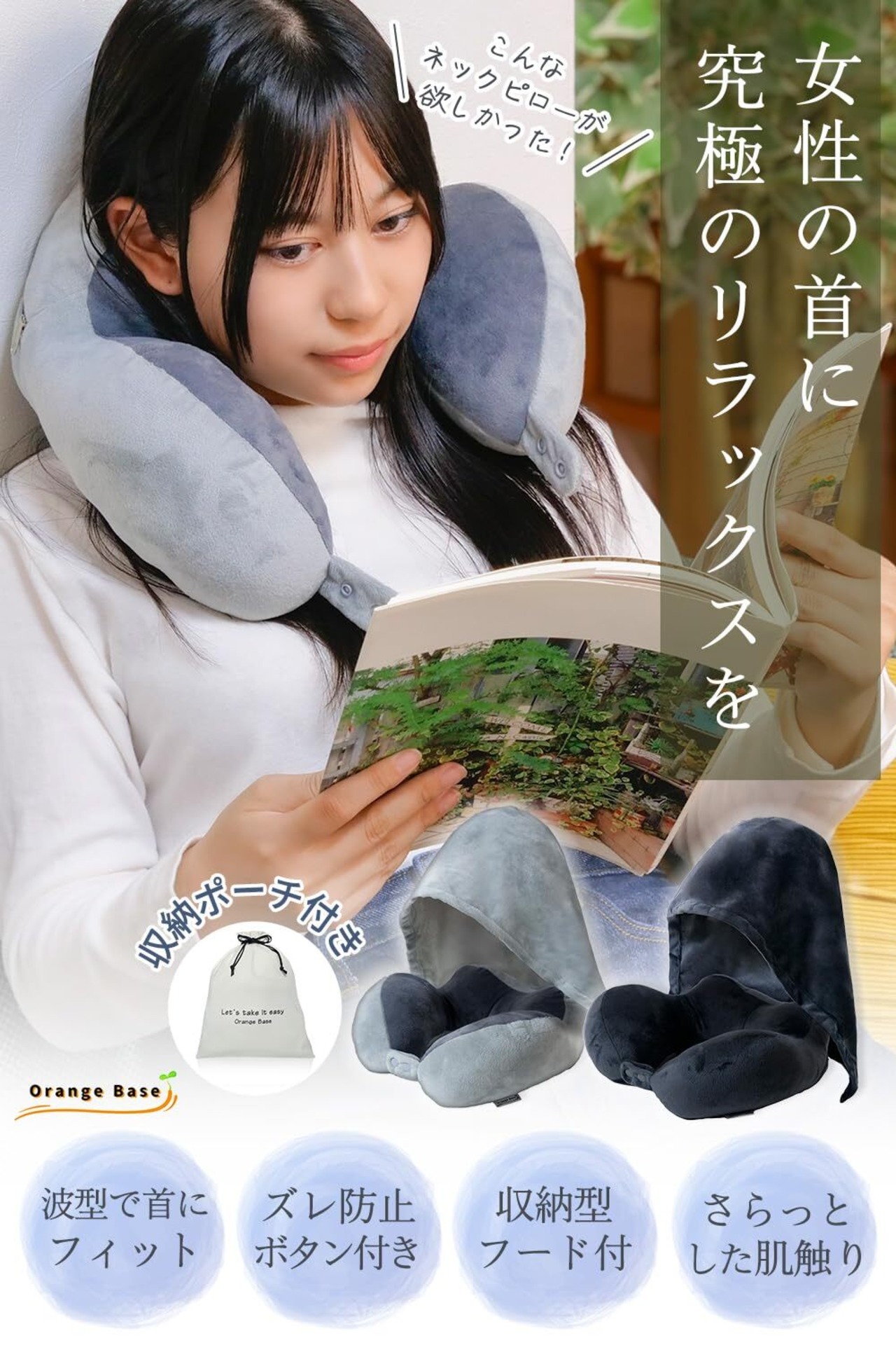 ネックピロー オリジナル収納袋付 遮光フード付 サイズ調整ボタン 男女兼用 4つコブが頭部をサポート さらさら生地 旅行 車 飛行機 仮眠 携帯枕 オフィス 昼寝 首枕 ライトグレー