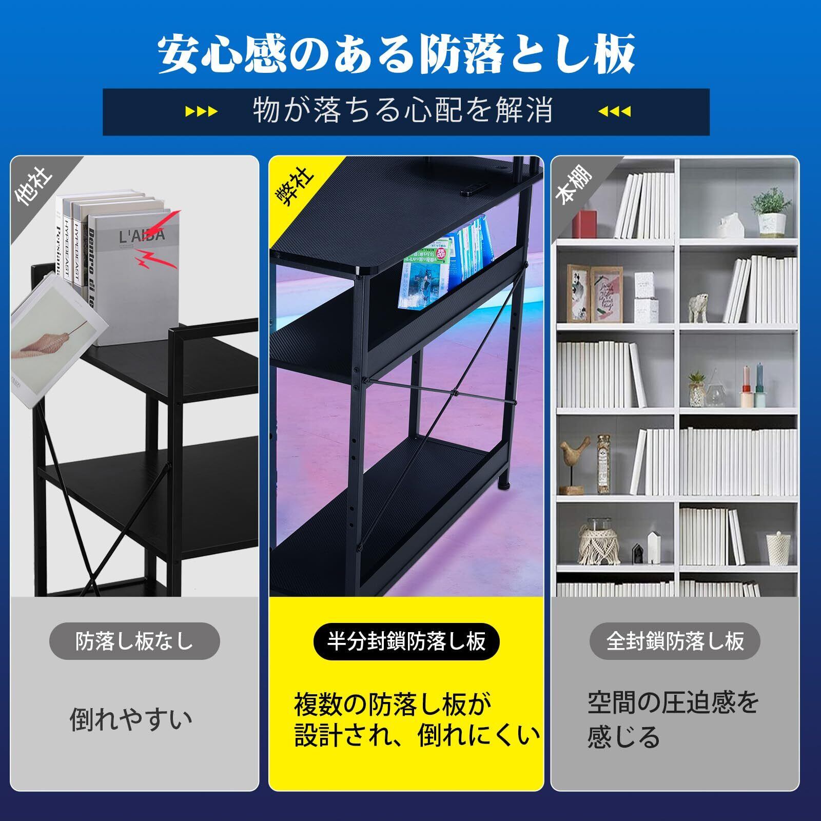 【モニターアーム対応可能】モニターアームを取り付けて、モニター下のスペースを節約します。自由に調整できるモニターアームは、腰の正しい姿勢を長時間保ち、腰椎を守り、健康な習慣を身につけるのに役立ちます。【収納MAX!可動式棚】パソコンデスクの下の棚は3段階で調節可能で、高さに合わせて自分なりのDIYができます。PCケースやライトノベル、花瓶などを手軽に収納でき、非常に便利です。