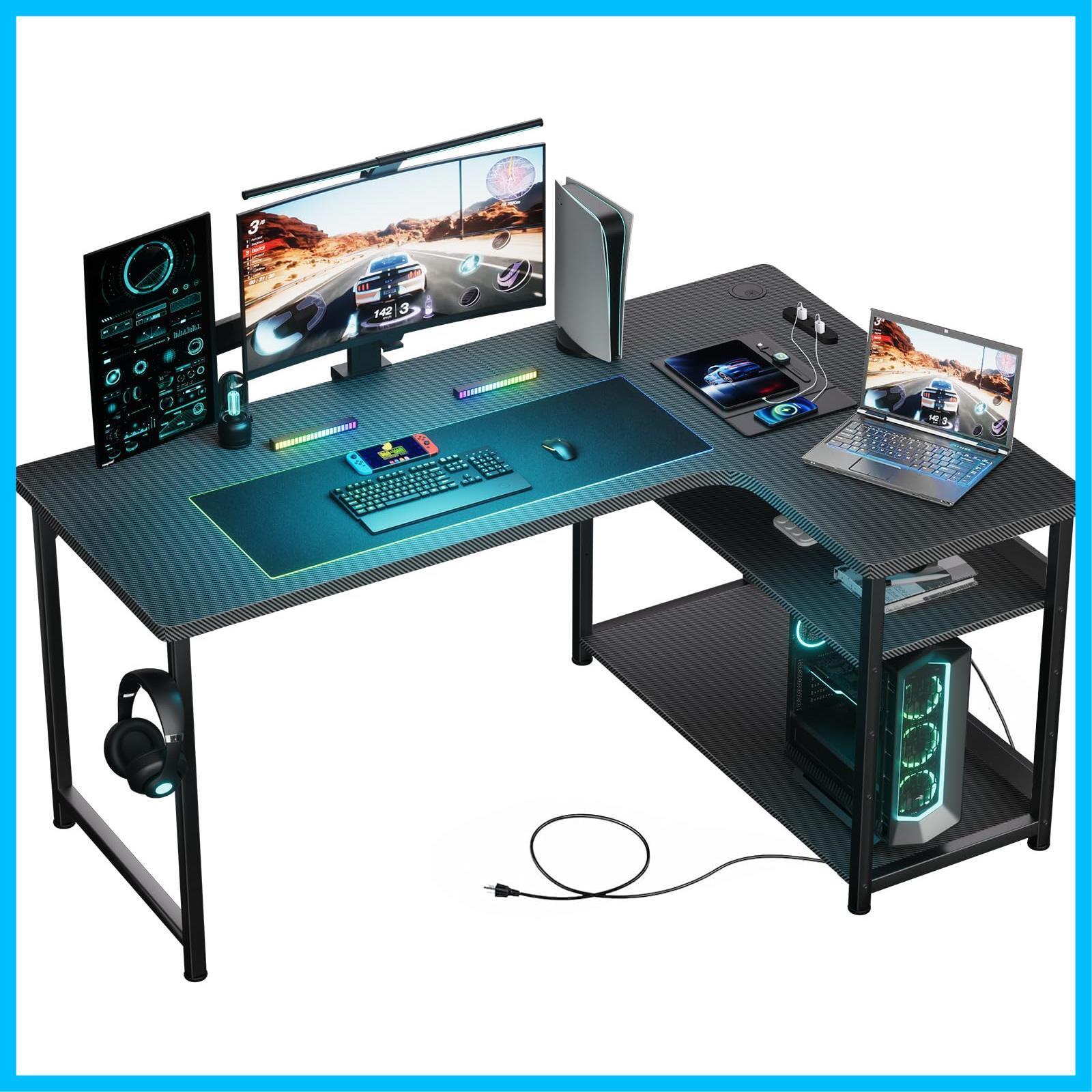 GTRACING ゲーミングデスク パソコンデスク L字 カーボン調 コンセント付き ラック付き モニターアーム対応 棚高さ調節可能 配線穴 右棚 79奥行き*110幅*74.5高さ DL001 黒系 机 pcデスク 勉強机 オフィスデスク 書斎デスク 棚付きl字デスク ゲーム ワーク
