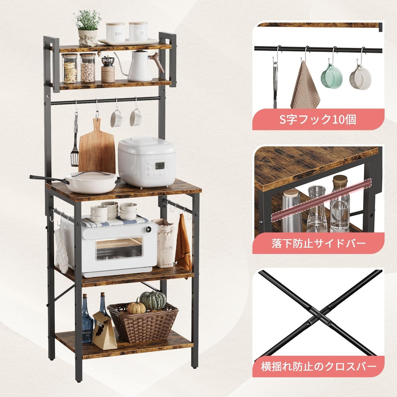 レンジラック 幅60レンジ台 電子レンジラック 大型レンジ対応キッチンラック 高さ調整可動棚 高耐荷設計 高さ147.8cm 省スペース 10個S字フック アジャスター付き 食器棚 レンジボード キッチン収納 (ブラウン)