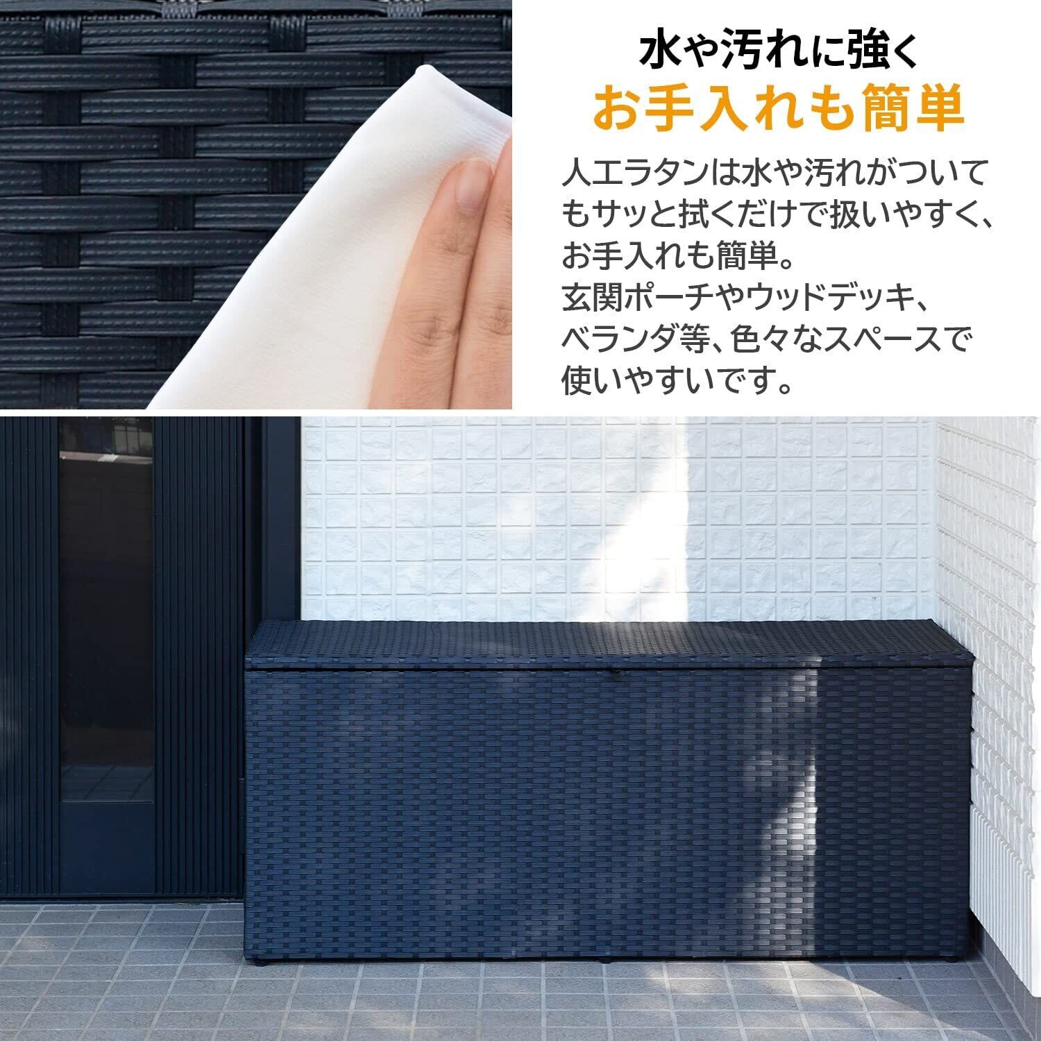 【特徴】玄関先や軒先・お庭などでの収納に便利な、自然に馴染むウィッカー編みのスチール製収納庫です。カラーはダークブラウンです。幅120cmタイプです。ガーデングッズ・おもちゃ・工具箱など様々なものが収納できます。天板の上に座れてベンチとしても使用できるので、疲れた時に一息つく為のベンチやイス、玄関内の腰掛けとしても便利です。奥行きがわずか39cmなので限られたスペースにも設置出来て省スペースです。南京錠(別売)で施錠も可能です。ガスシリンダーダンパー仕様でフタ板開閉操作がスムーズで簡単です。