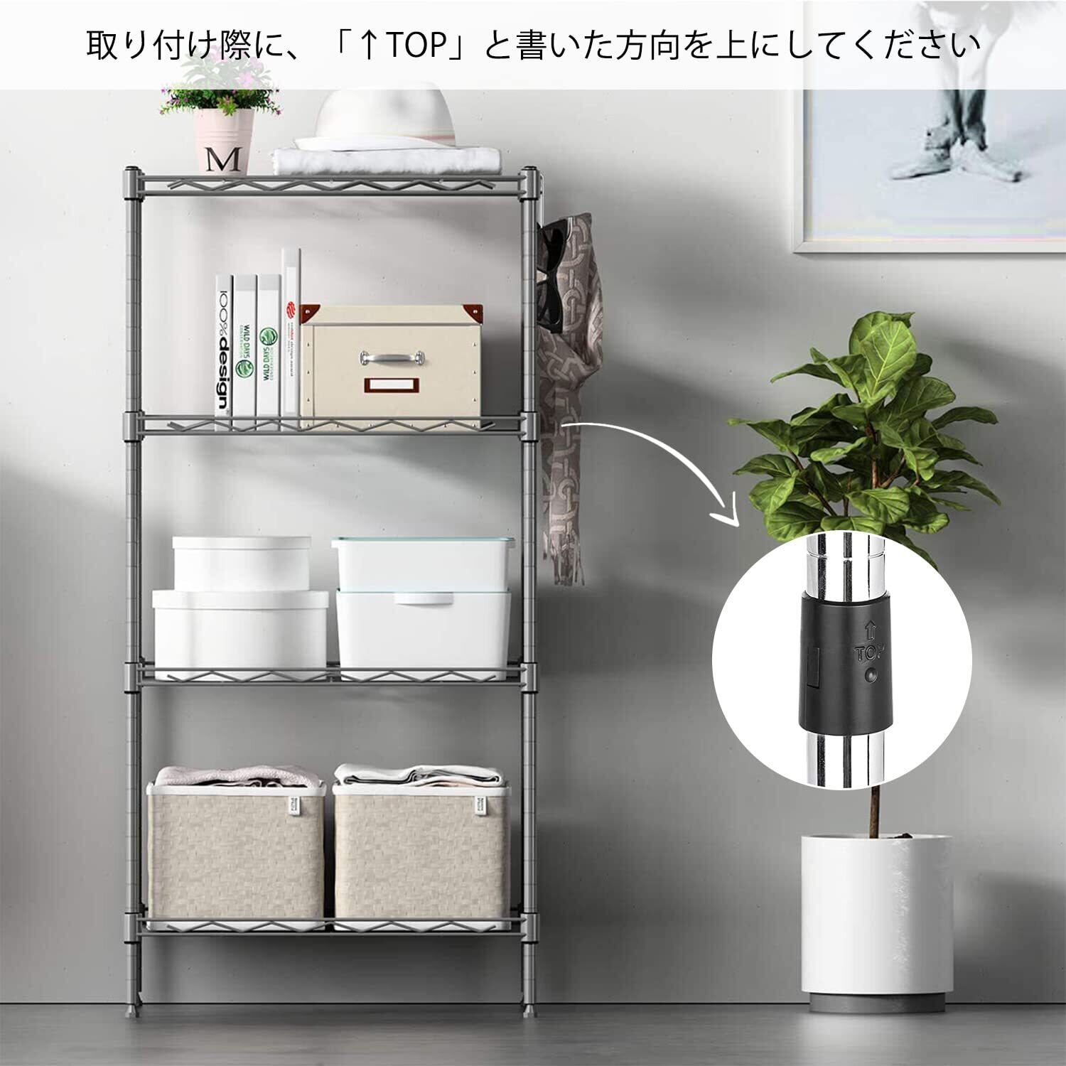 「取り付け方法」棚板1枚を取り付けるには4組(8つ)のスリーブが必要になります。「TOP」と書かれた方を上にして、半分にわかれている円筒型を噛み合わせるようにしてポールに取り付けます。そしてスリーブを下方向にスライドさせて、「カチッ」と音がしたら、スリーブがポールの溝にしっかりと固定されます。
