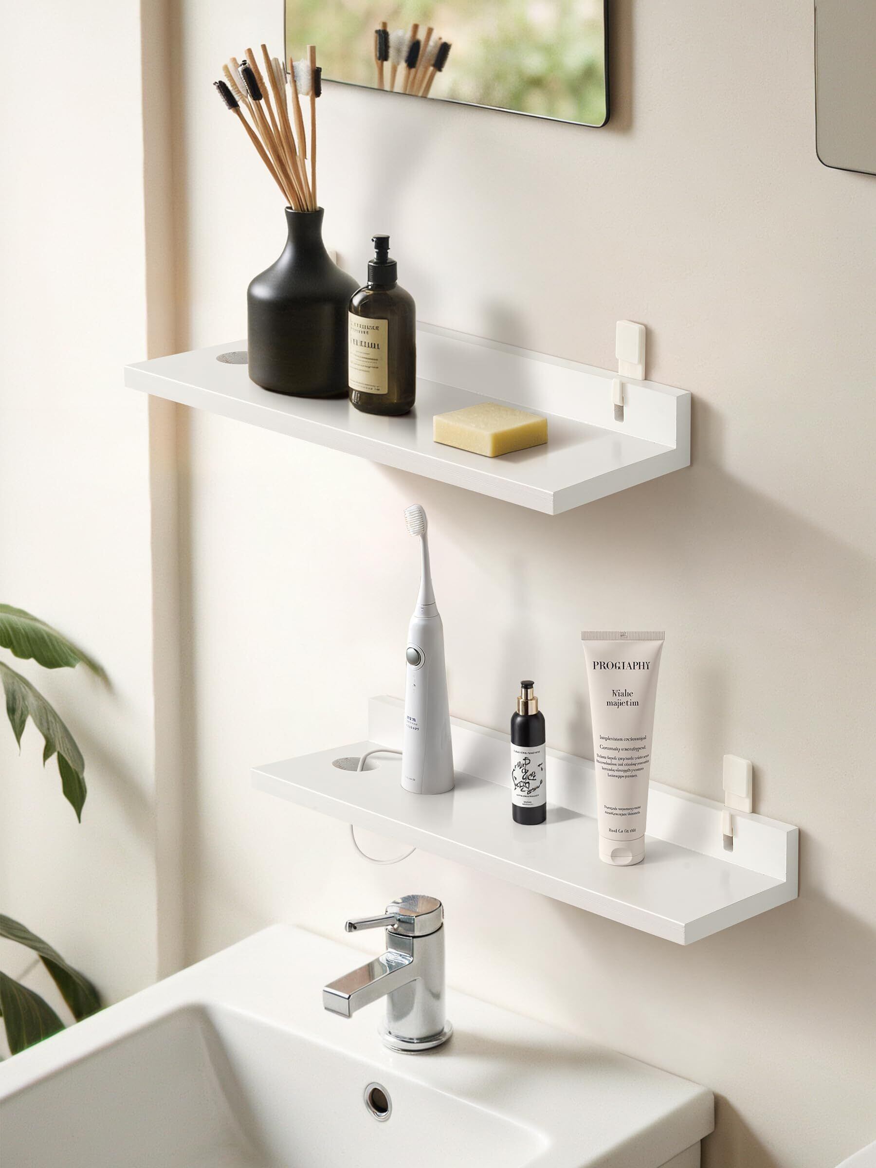 【幅広い用途】特別に設計された充電穴により、使用がより便利になり、ルーター、モニター、携帯電話、電動歯ブラシなどを簡単に配置できます。収納ラックは、バスルーム、キッチン、書斎、リビングルームなどに簡単に設置できます。既存のインテリアに自然に溶け込み、スタイリッシュな空間を演出します。壁面収納スペースを増やすことができます。小物や本、写真、鉢植えなどの収納にも便利です