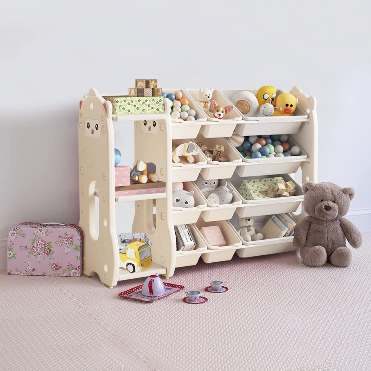 【多機能】:この2-in-1おもちゃ収納ラックは収納スペースの良い解決策になります。 子供のおもちゃ棚や子供の本棚として使用することができます。 この収納セットには12個の収納箱と3段の本棚があり、本、おもちゃ、人形などを収納でき、子供たちが良い収納習慣を身につけることができます。