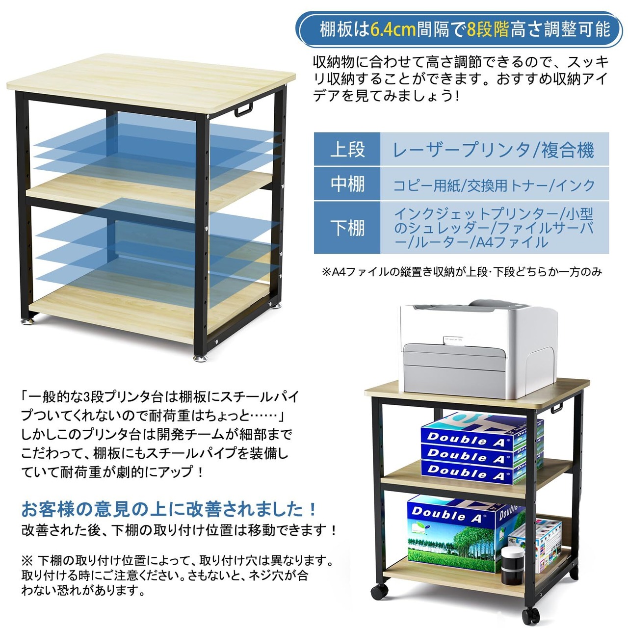 [総耐荷重90kgで支える・幅60×奥行50㎝の広い天板] 堅牢なスチールフレームを採用した、頑丈な3段プリンタ台です。総耐荷重はなんと90kg!インクジェット複合機や事務用品のストック等、重いものを載せてもしっかり支えます。 オフィスで使用する大型のレーザープリンタもOKの広い天板を装備。収納はたっぷりあるので、上段にレーザープリンタ、中段にはコピー用紙や交換用トナーやインクなどの消耗品、下段にインクジェットプリンターやA4ファイルを置いて自由に収納できます。