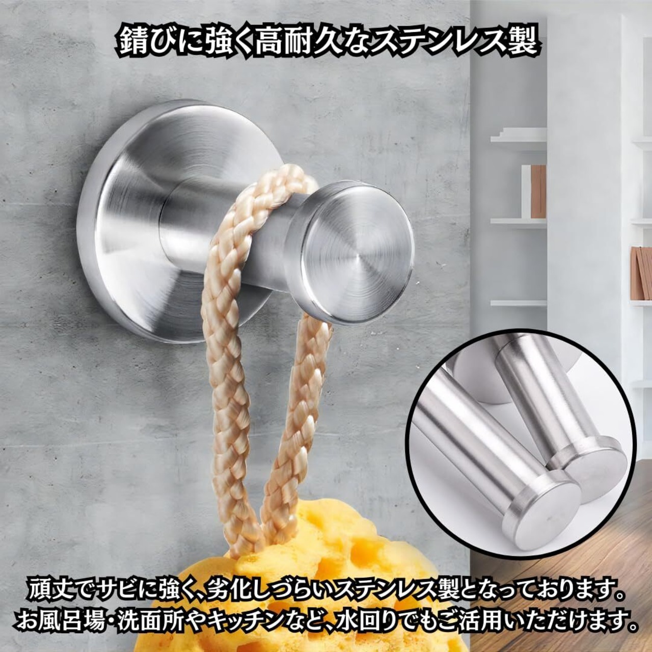 【高耐久なステンレス製】素材は頑丈でサビに強いステンレス製となっております。玄関やリビングは勿論、お風呂場や洗面所、トイレやキッチンなどの水回りでもご活用いただけます。今までデッドスペースとなっていた様々な空間が、収納スペースに早変わり!