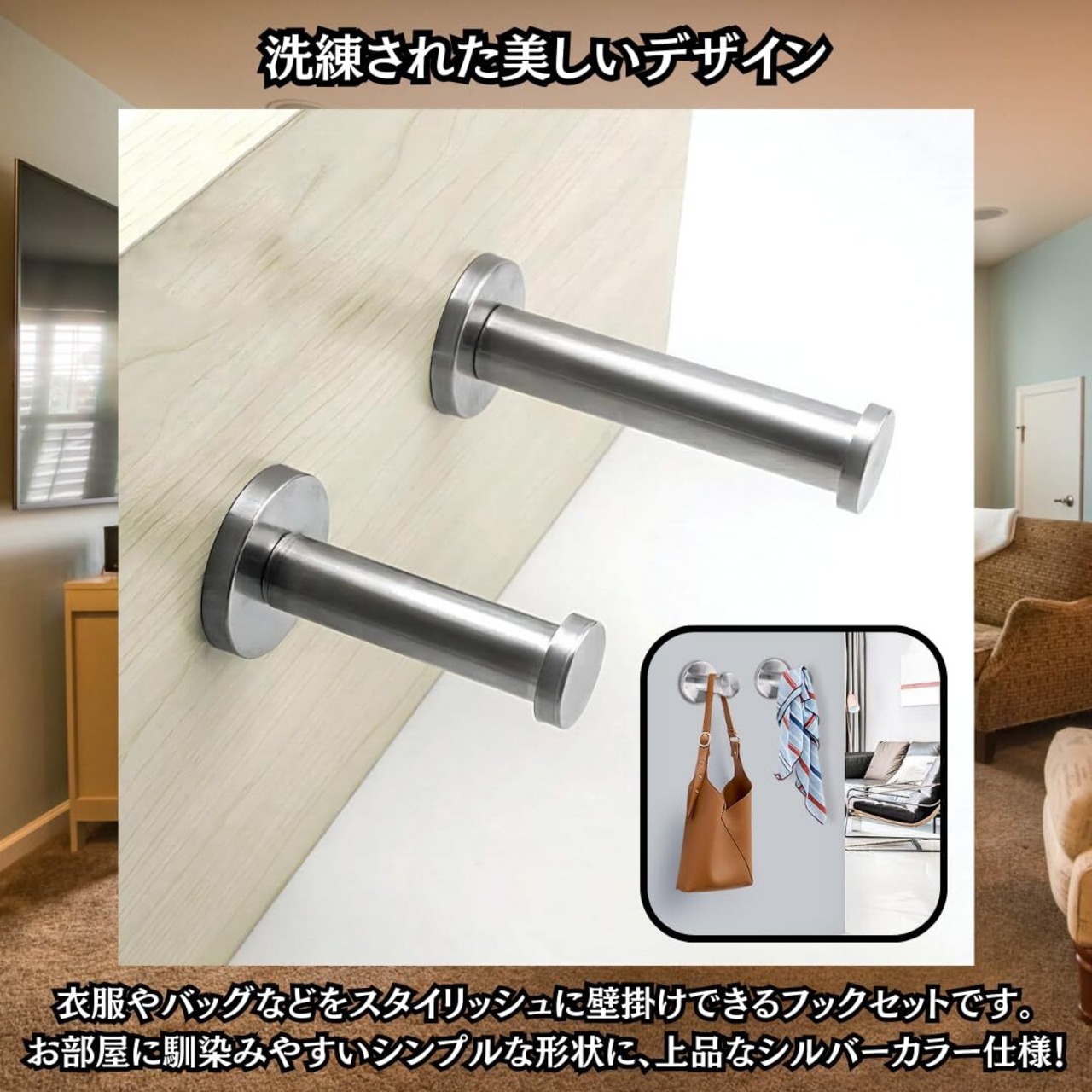 【洗練された美しいデザイン】スタイリッシュな外観で、帽子・衣服・バッグなどをスッキリと吊り下げられるウォールフックセットです。どんなお部屋にも馴染むシンプルなデザイン、上品なシルバーカラーとなっております。お部屋のアクセントとして、おしゃれに収納を楽しみたいあなたに!