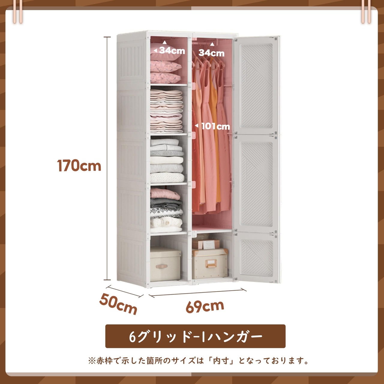 ワードローブ クローゼット 大容量 ハンガーラック シンプル収納棚 衣類ケース 一体折り畳み式 洋服収納ラック 扉付き 雑物 小物 耐荷重 省スペース 頑丈 リビング (6グリッド-1ハンガー)