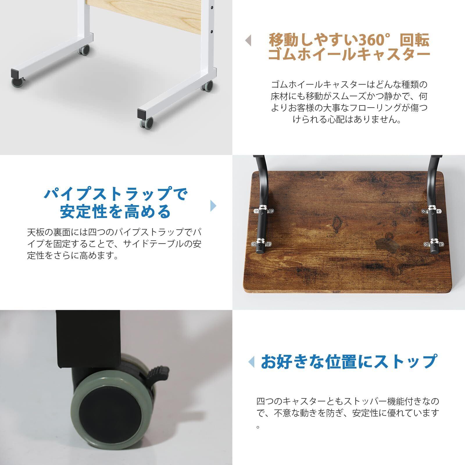 【最新改良版・組立簡単】従来のサイドテーブルの問題点を改善して、本製品は天板の厚みとスチールフレームの厚みを増加することによって、安定性、強度及び耐久性が強化され、従来のサイドテーブルより頑丈になっています。また、より簡単に取り付けできるために、取り付けが容易な六角ボルト(取付工具付き)を使用して、従来の取り付けにくいプラスネジの代わりに、天板裏のネジ穴を従来のゴム部品から堅固な金属部品に変え、高級感のあるゴムホイールキャスターで従来の安価なプラスチックホイールキャスターの代わりにしました。日本語説明書付きなのでプロでなくても簡単に組み立てられます。更に、製品が安全にお客様のもとに届くよう、全ての製品は高品質梱包材で梱包されております。