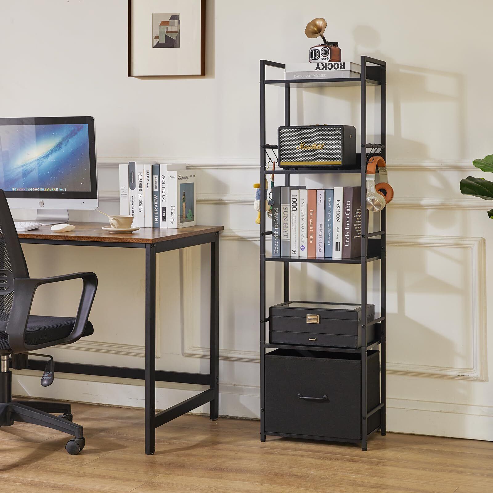 省スペース: このスリムな本棚には5つの棚があります。コンパクトで大容量な設計なので、床面積をあまりとりません。このおしゃれ本棚を使って、お気に入りの本、工芸品、写真アルバム、鉢植えなどを置くことができます。必需品や装飾品の保管や展示に最適です