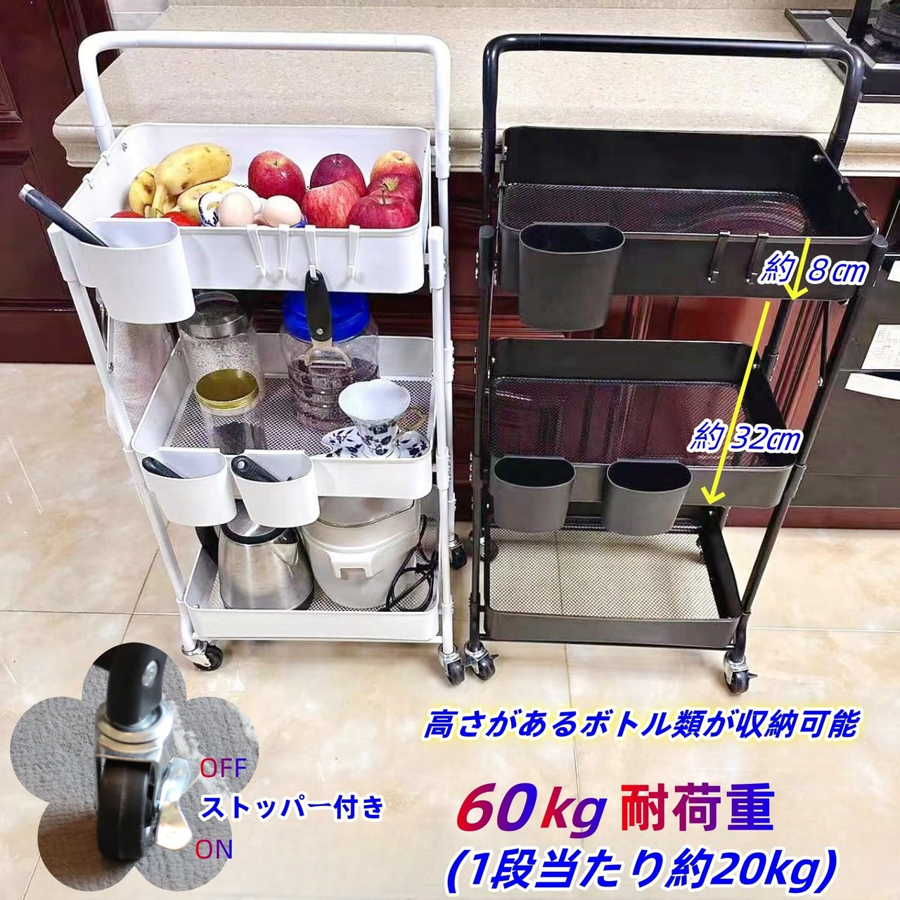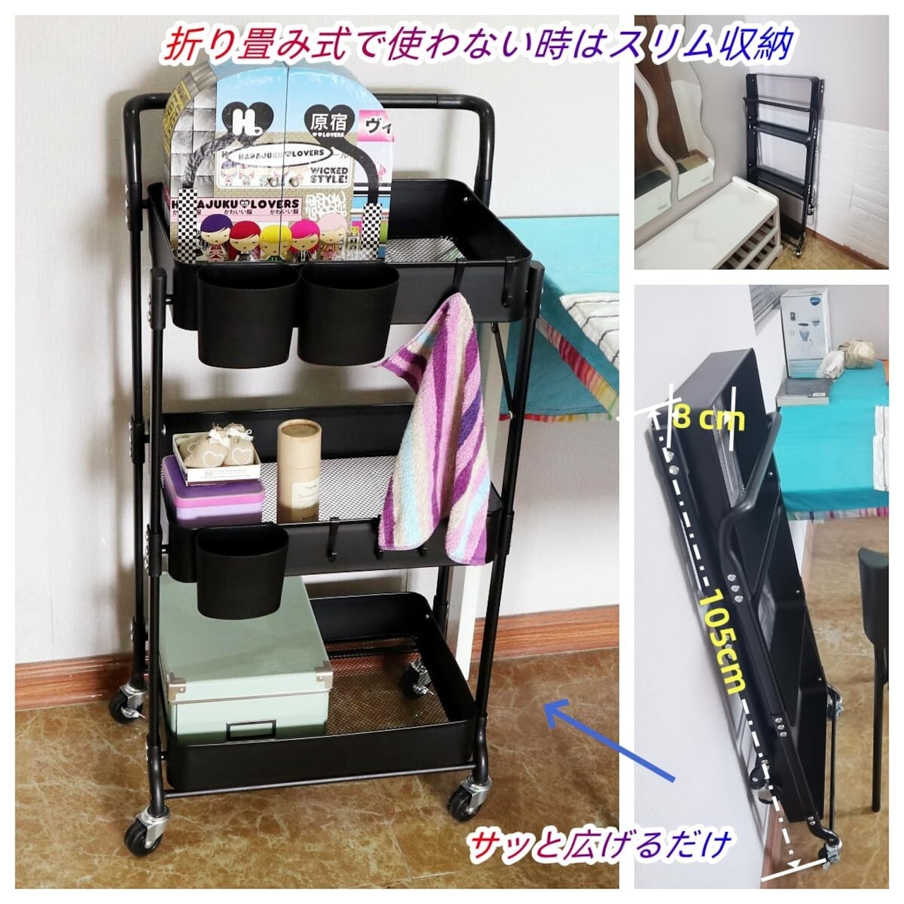 キッチンワゴン 折り畳み 3段タイプ 耐荷重60KG 幅46cm×奥行30cm×高さ82~93cm シンプルさ 収納ワゴン スチール製ボデイ キャスター付き スムース移動 吊り下げカップとフック小物収納 組立商品 (ブラック, 折畳3段)