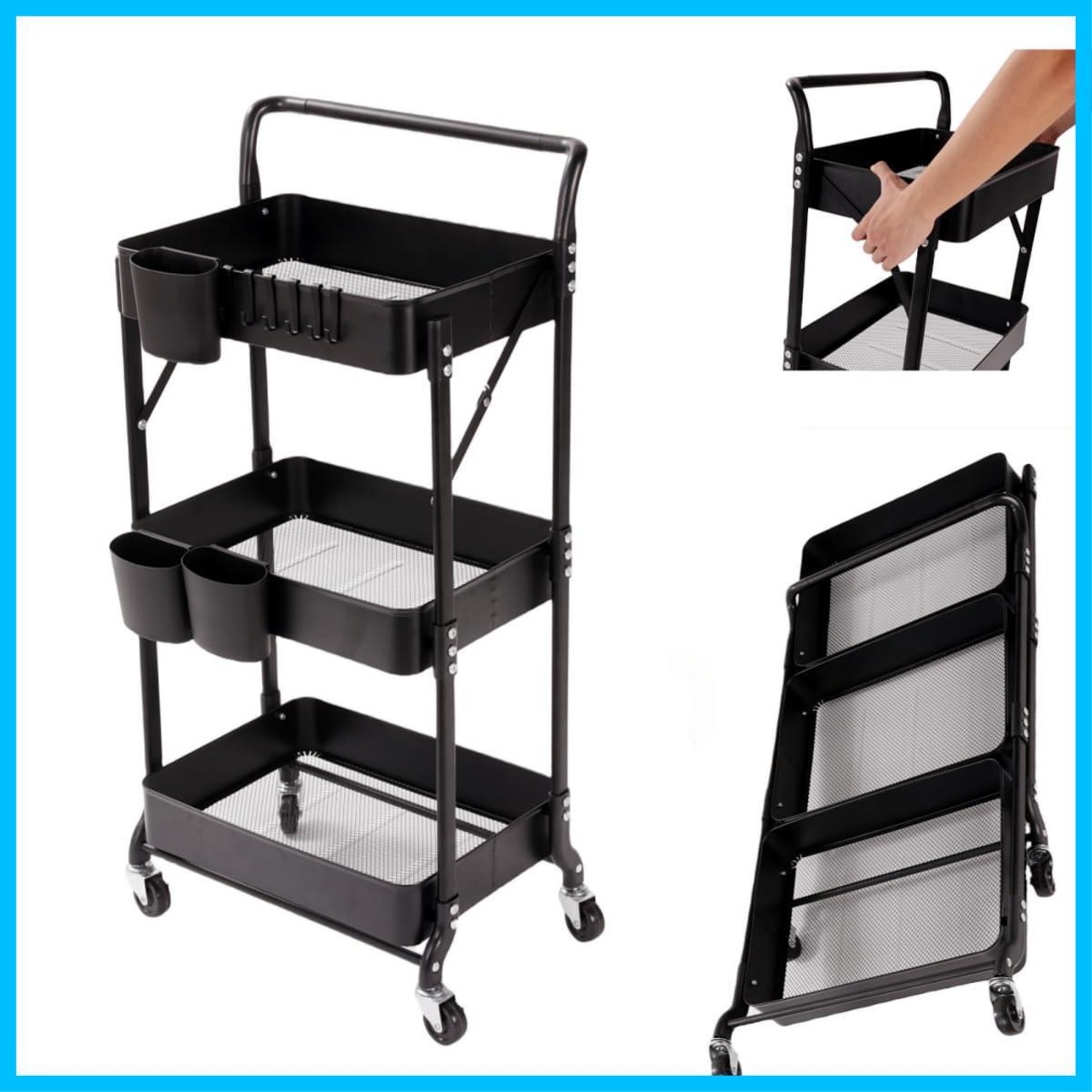 【人気商品】キッチンワゴン 折り畳み 3段タイプ 耐荷重60KG 幅46cm×奥行30cm×高さ82~93cm シンプルさ 収納ワゴン スチール製ボデイ キャスター付き スムース移動 吊り下げカップとフック小物収納 組立商品 (ブラック, 折畳3段)
