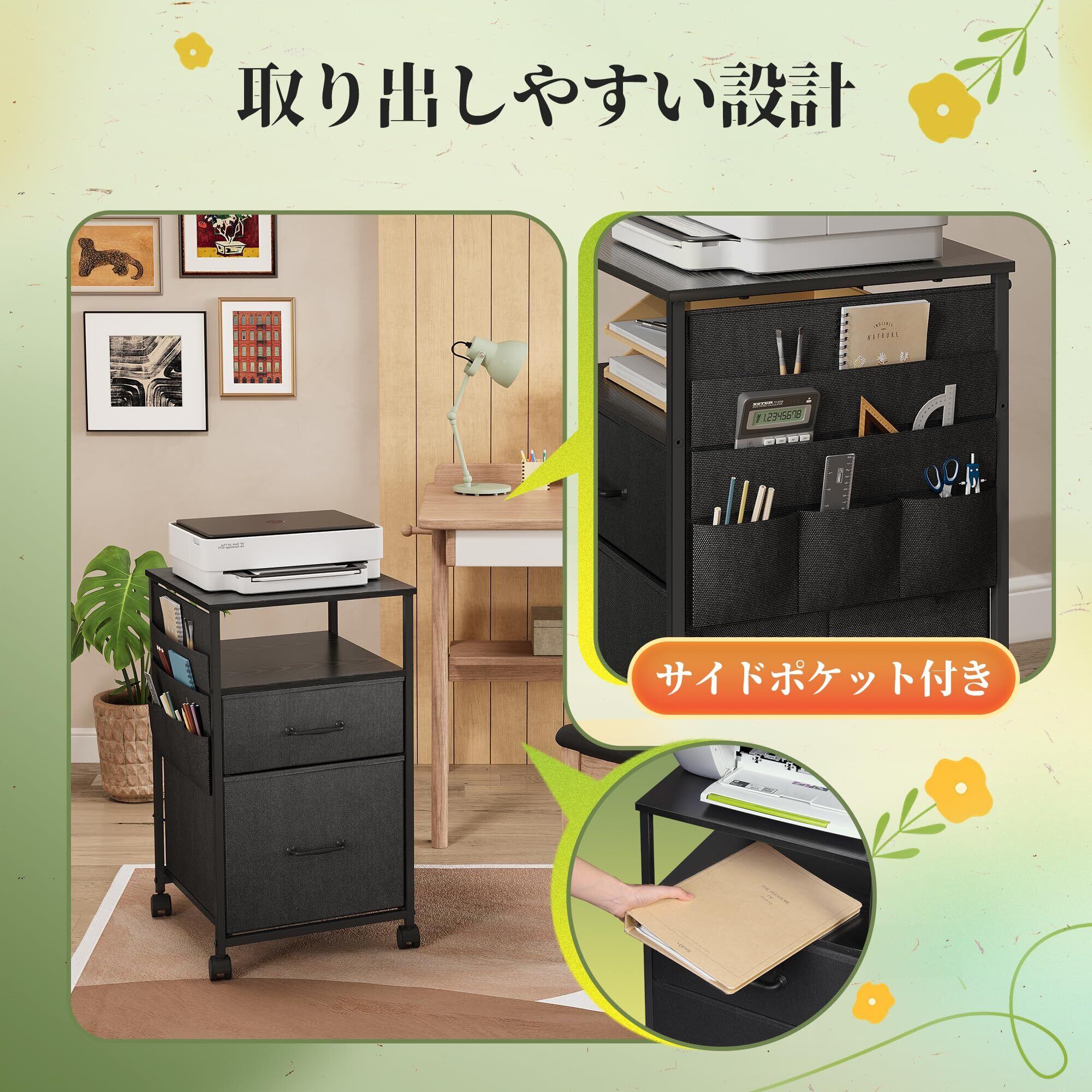 デスクワゴン キャビネット 収納 布製 ファブリック 二杯引き出し付き キャスター付き 引き出し付き サイドポケット付き サイドワゴン サイドデスク サイドチェスト ファイルワゴン 袖机 プリンター台 リッビング 書斎 A4ファイル対応 移動便利 ブラック