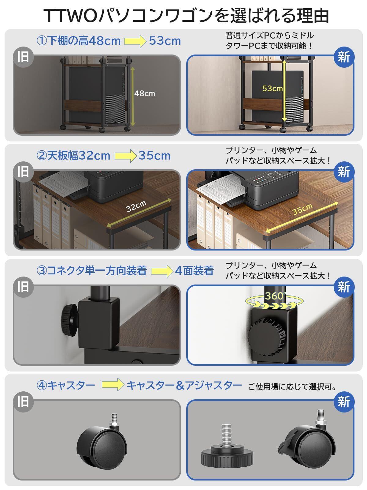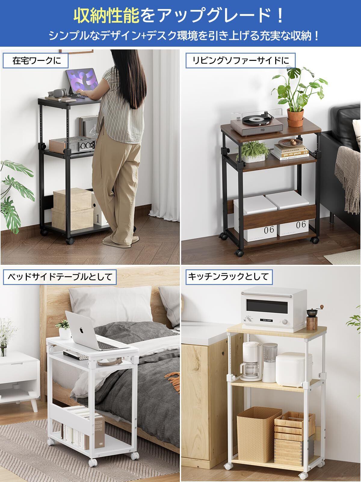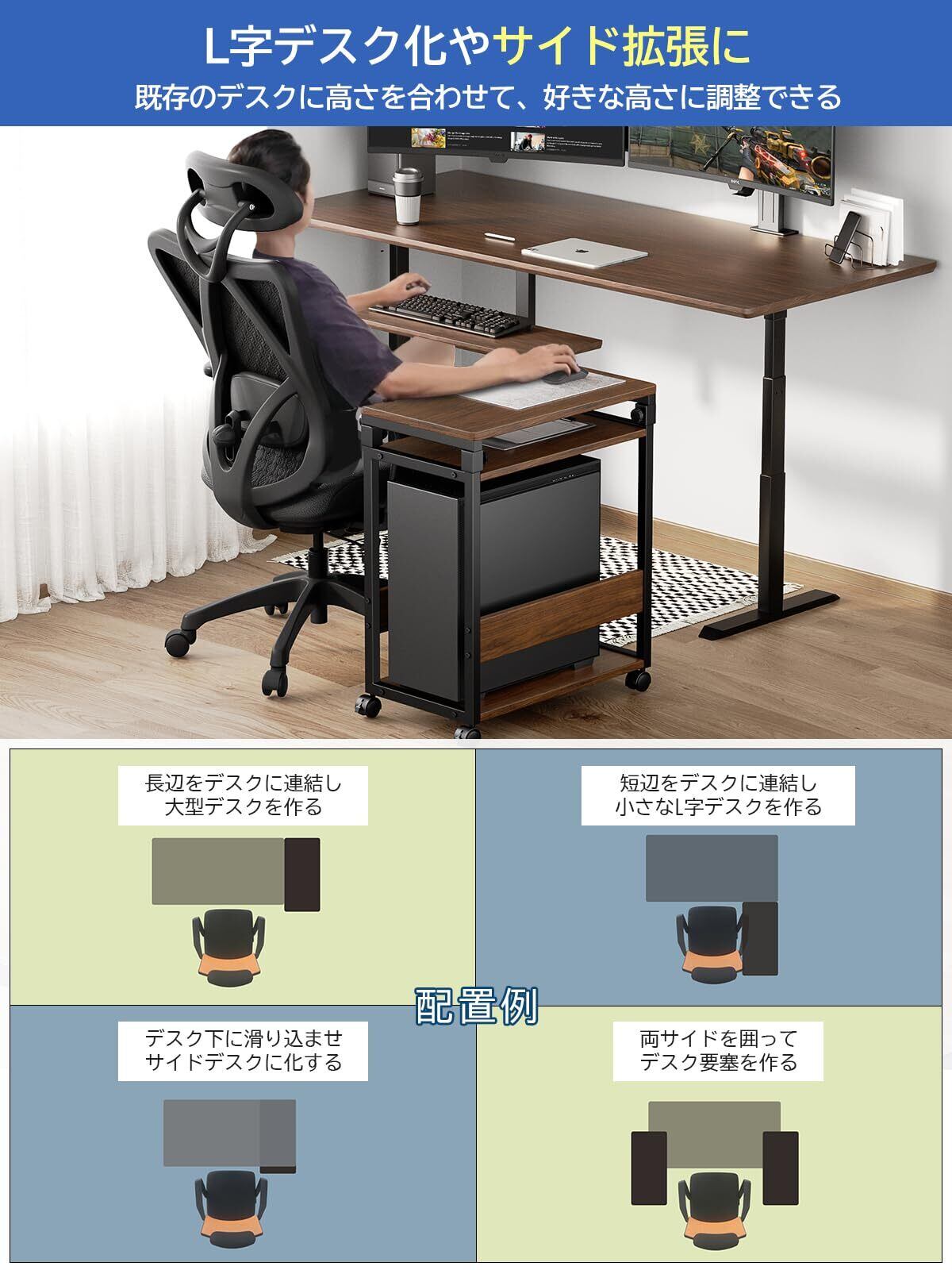 【ここが変わった!お客様の声に応じて4点を改良しました!】①天板幅32cm→35cm/②下棚の高さ48cm→52cm/③高さ調整コネクタ単一方向装着→4面装着。④キャスターだけ→キャスターとアジャスター両用できました。ゲーミングデスクのL字デスク化やサイド拡張に。上板にプリンター、中板に小物やゲームパッド、アケコンなどを収納できます。また、下板上にミドルタワーPCまでのデスクトップパソコンも格納出来ますので、テレワークやeスポーツに最適◎