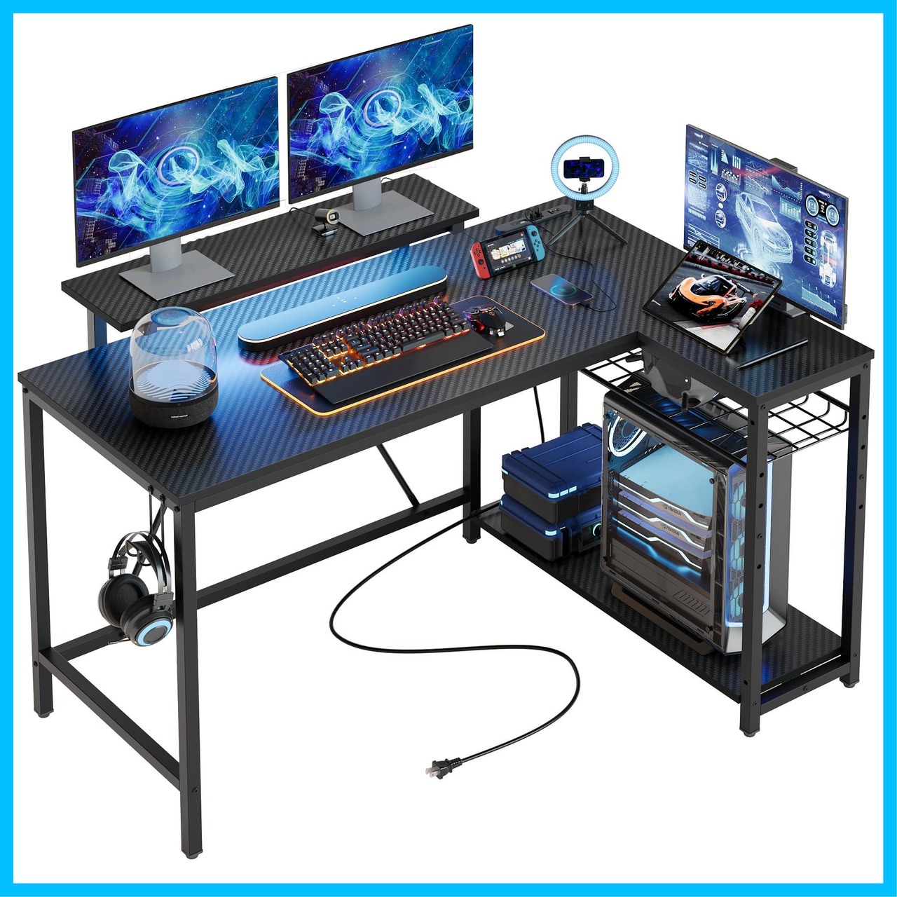 ゲーミングデスク L字デスク コンセント付き 幅122cm USB-C対応 パソコンデスク 机 pcデスク L字型 収納ラック付き LEDライト付き 棚板高さ調節可能 モニター台付き ブラック