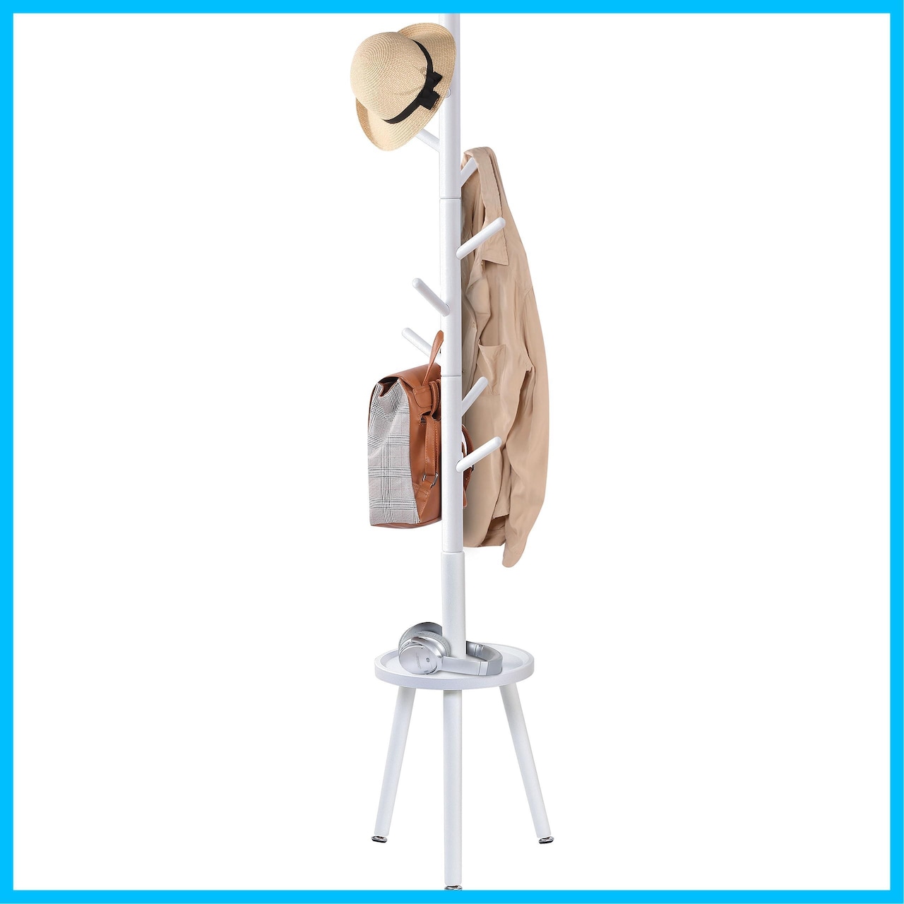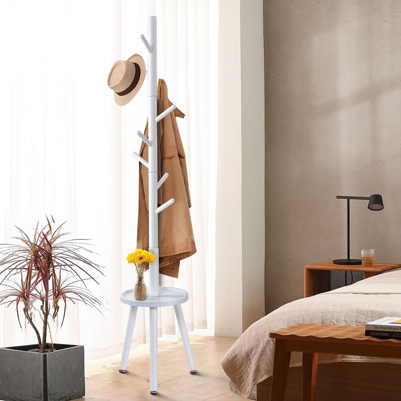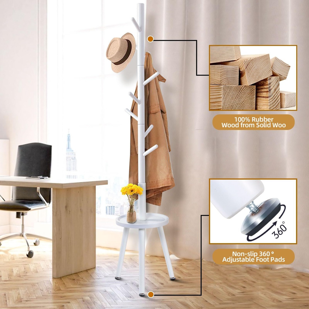 Yawinhe ポールハンガー 木製 コートハンガー コート掛け サイドテーブル付き 8つのフックがついたハンガーラック 3段高さ調節可能 高耐荷重 頑丈 枝型フック設計 倒れにくい 高さ182cm, 組立て簡単 (ホワイト)