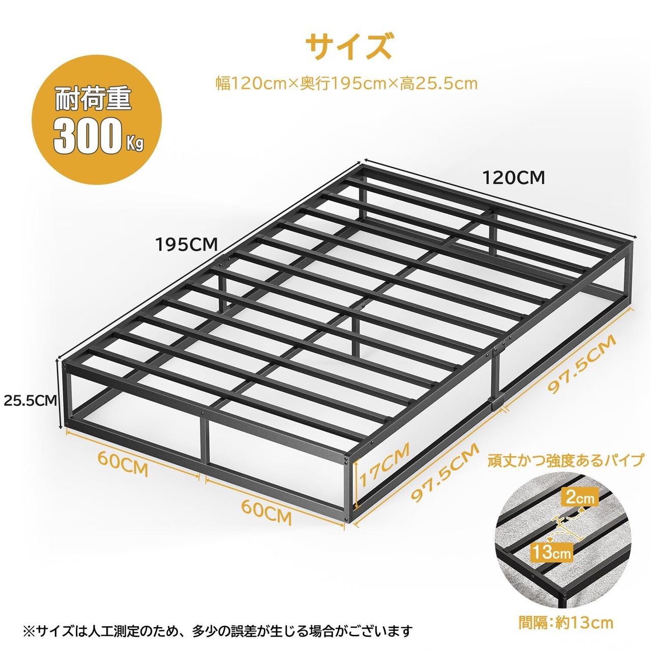 【商品仕様】サイズ:幅120cm×奥行き195cm×高さ25.5cm 重量:約17.5kg ベッド下収納高:約17cm 耐荷重:約300Kg PRTONE ベッドフレームは優れた安定性・静音性・耐久性・通気性を実現させる設計で安心且つ快適な睡眠をサポートする上、収納スペ-スも確保しております。また、様々なテイストのお部屋にマッチしてくれるデザインで、スッとお部屋に溶け込んでくれます。