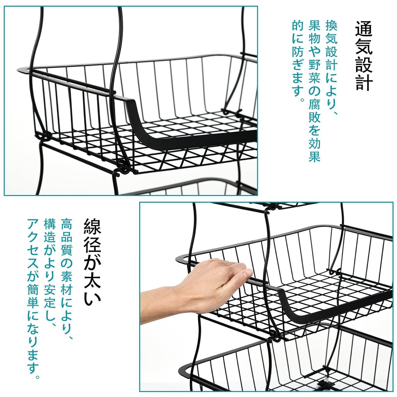 【通気性が優れた】隙間が多く、通気性に優れた、アミ状フレームのバスケットラックで、湿気がこもりにくく、玉ねぎや芋類などの野菜を鮮度を守りながら保管して頂けます。