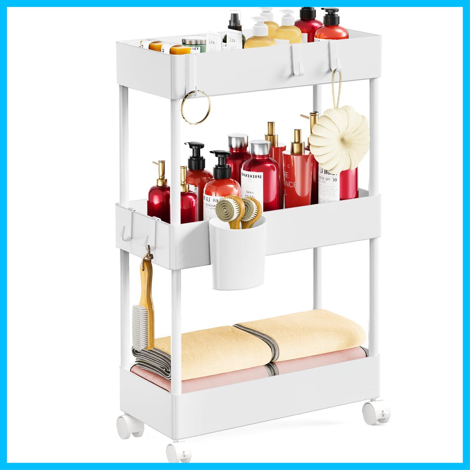 キッチンワゴン 隙間収納 キャスター付き ワゴン キッチン 洗面所 収納 スリム 収納カート 13.5cm 18cm 22cm 冷蔵庫横 台所 浴室 トイレ 3段 4段 おしゃれ 頑丈 組立簡単 フック&収納カップ付き (18cm-[3段式]-ホワイト)