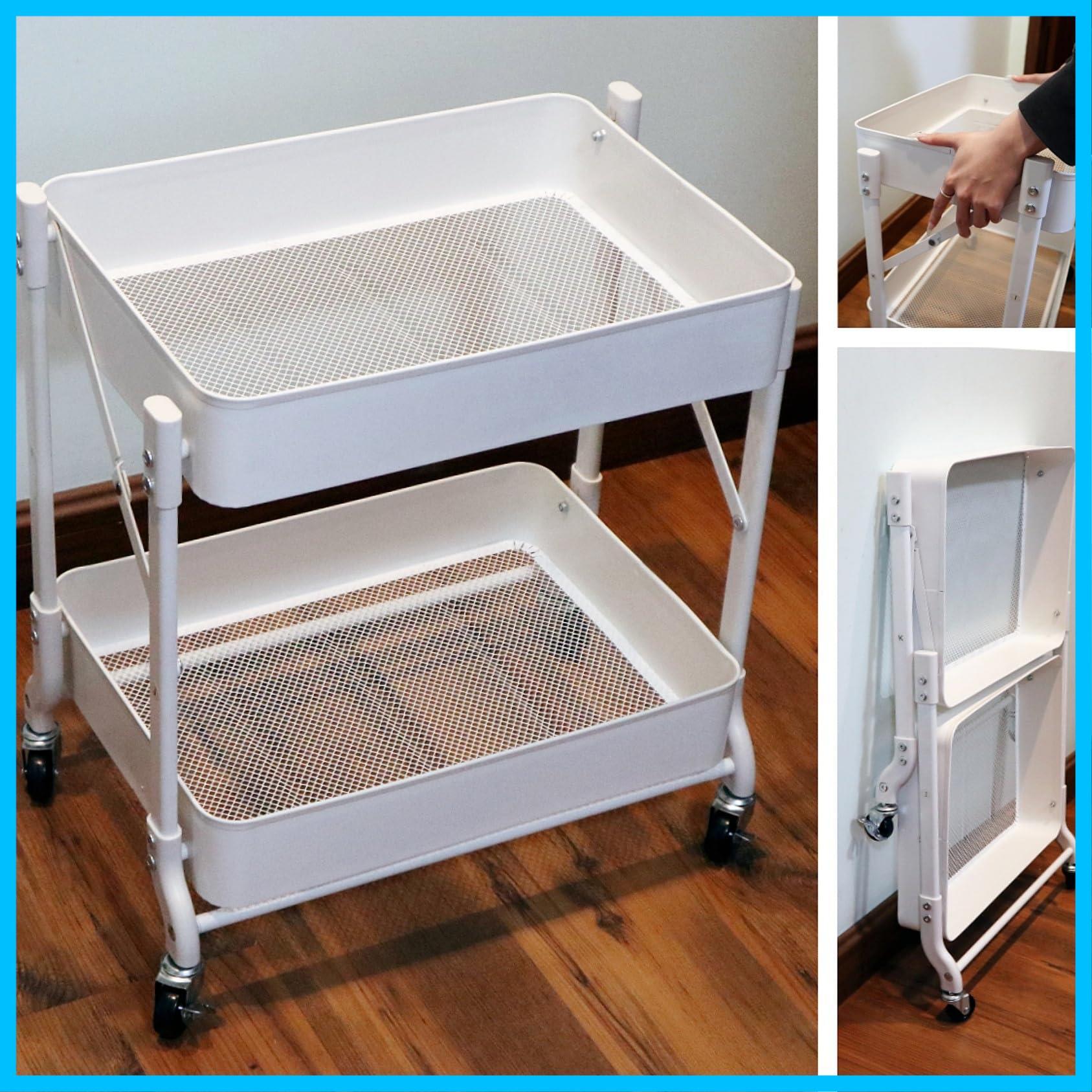 キッチンワゴン 折り畳み 2段タイプ 耐荷重40KG 幅46cm×奥行30cm×高さ51cm シンプルさ 収納ワゴン スチール製ボデイ キャスター付き スムース移動 吊り下げカップとフック小物収納 組立商品 (ホワイト, 折畳2段)