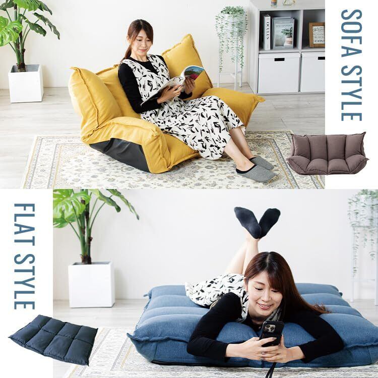 背もたれ:14段階リクライニング機能式。肘・背サイド部分※4カ所:14段階リクライニング機能式。座面及び背もたれ部分の中材に流動性の高いチップウレタンを入れています。表生地には水を弾く撥水加工を施した肌触り柔らかなショートベロア生地を採用。裏面にして真中部分から半分に折り畳めるギアを採用し、収納することが可能になったコンパクト仕様です。※実用新案取得済