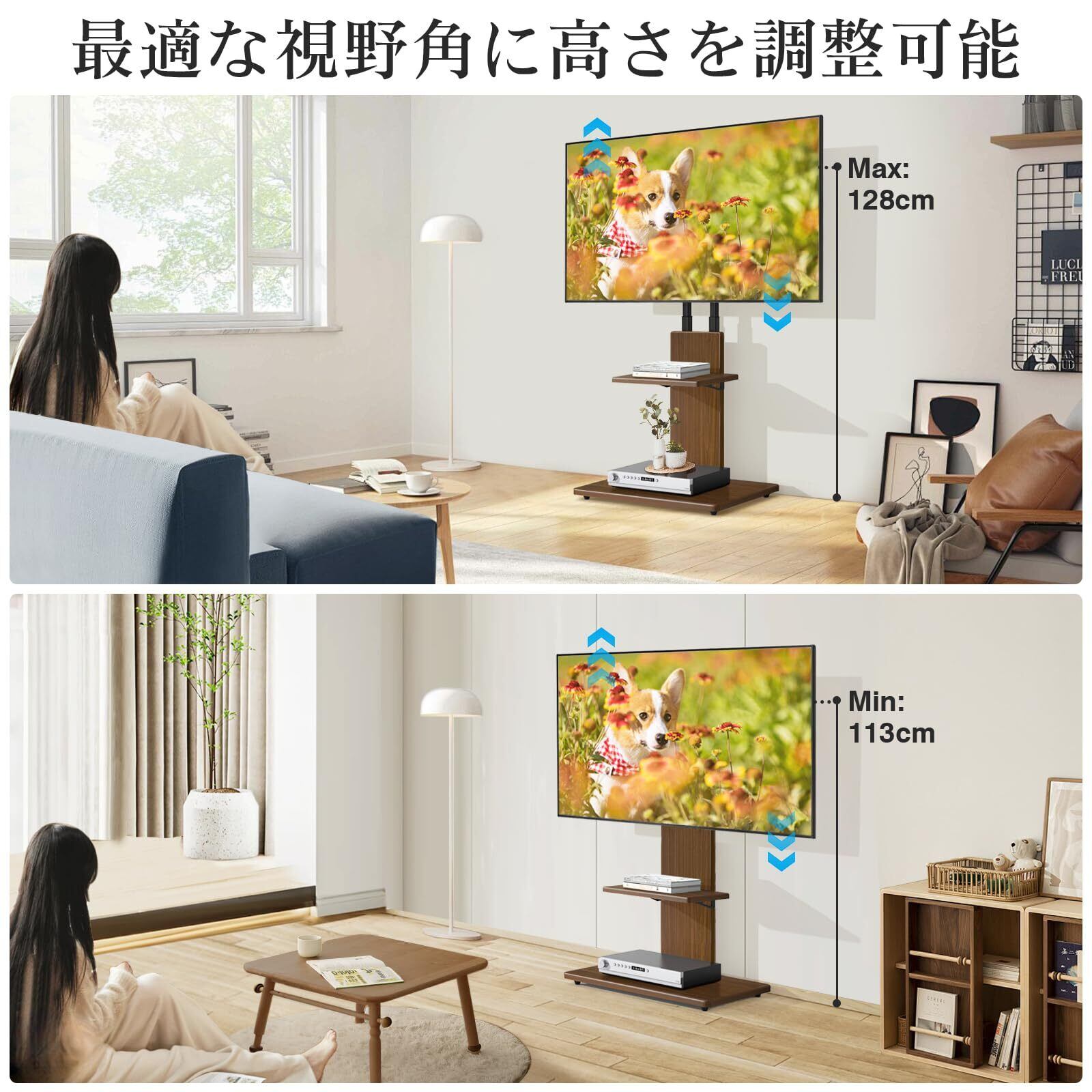 高さ、左右調節可能:tvスタンドは、ブラケット3つレベル、メタルポール4つレベル、合計12段階の高さ(113から128まで)調整が可能です。また、テレビスタンド 壁寄せは左右に25度首振りが可能で、お好みに合わせた視角と高さに調整でき、快適な視聴体験を提供します。