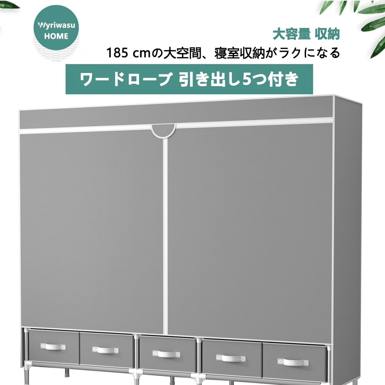 ワードローブ 引き出し5つ付き 大容量 収納 クローゼット おしゃれ 不織布 簡単組立式 ハンガーラック 収納棚 防水 防塵 防汚(185×奥行45×高さ170cm) (グレー)